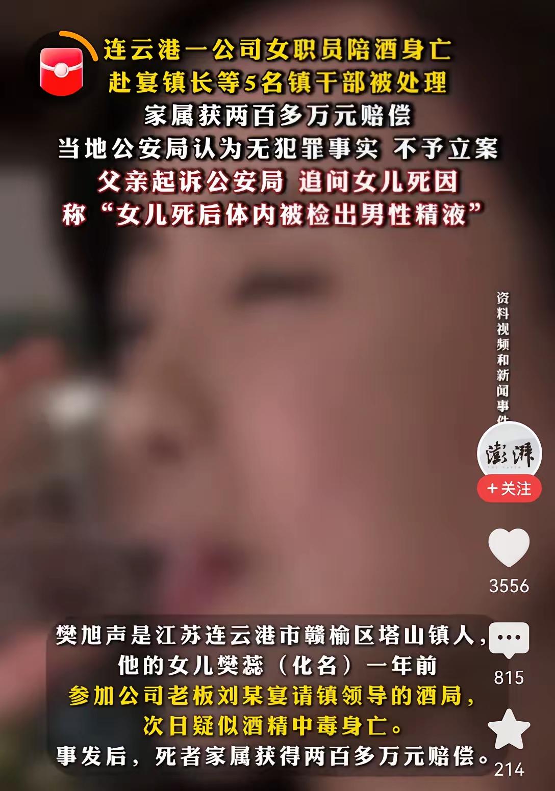 连云港女职员陪着5个人喝酒身亡,父亲追问死因:“女儿体内检出男性精 液”。 有人说,这女的其实也很明白自己要得到什么付出什么,没想到把命搭进去。都知道什么叫陪酒什么叫进步,当个普通人也挺好。 最讨厌喝酒的了,劝我喝酒的也烦。我觉得又不好喝不想喝怎么了,不喝还得被阴阳怪气。 据说当时赔偿款是:几个人一起赔偿135万,加上,其中一个人“另外”“单独”赔偿100万,一共赔了200多万。 如果老板跟她是自愿的,而且正是因为喝酒过多,导致的死亡,老板会承担什么责任,这个真不好说。 女的一定不要和男的出去,这个年代男的都不信男,时刻准备防着,女的要保护好自己,就是除了爱人谁都不要信。 这是去年的新闻,赔偿了钱又多给了,尸体也火化了,作为父亲,现在又来想要什么呢?当时不要钱不就得了,尸体一直停留在殡仪馆,网友都不会说什么。 都是成年人了,没有谁是无辜的。
