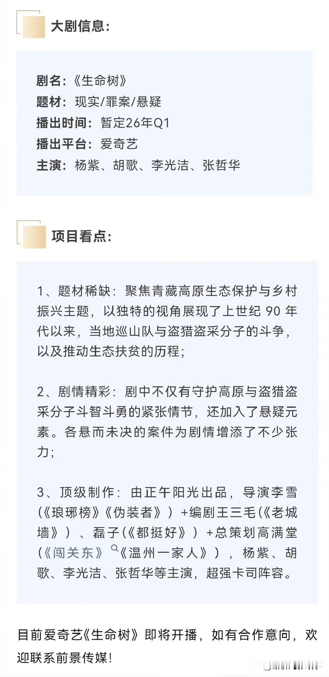 《杨紫胡歌新剧杀疯!杀青20天定档,这剧要炸》 刚在青海高原拍完188天的《生命树》,杀青仅20天就官宣2026年Q1爱奇艺开播,连央视片单都提前锁它。 这剧是真敢拼:杨紫素颜穿巡山制服扛高反拍戏,胡歌学藏语、糙汉造型骑烈马;正午阳光扎4000米无人区取景,道具全是磨旧的真装备。 配置更王炸:李雪导演+《都挺好》编剧,杨紫胡歌演巡山员&卧底,生态保护线缠悬疑案,题材稀缺又戳共鸣。 现在招商刚开就被品牌疯抢,明年开年剧王稳了。