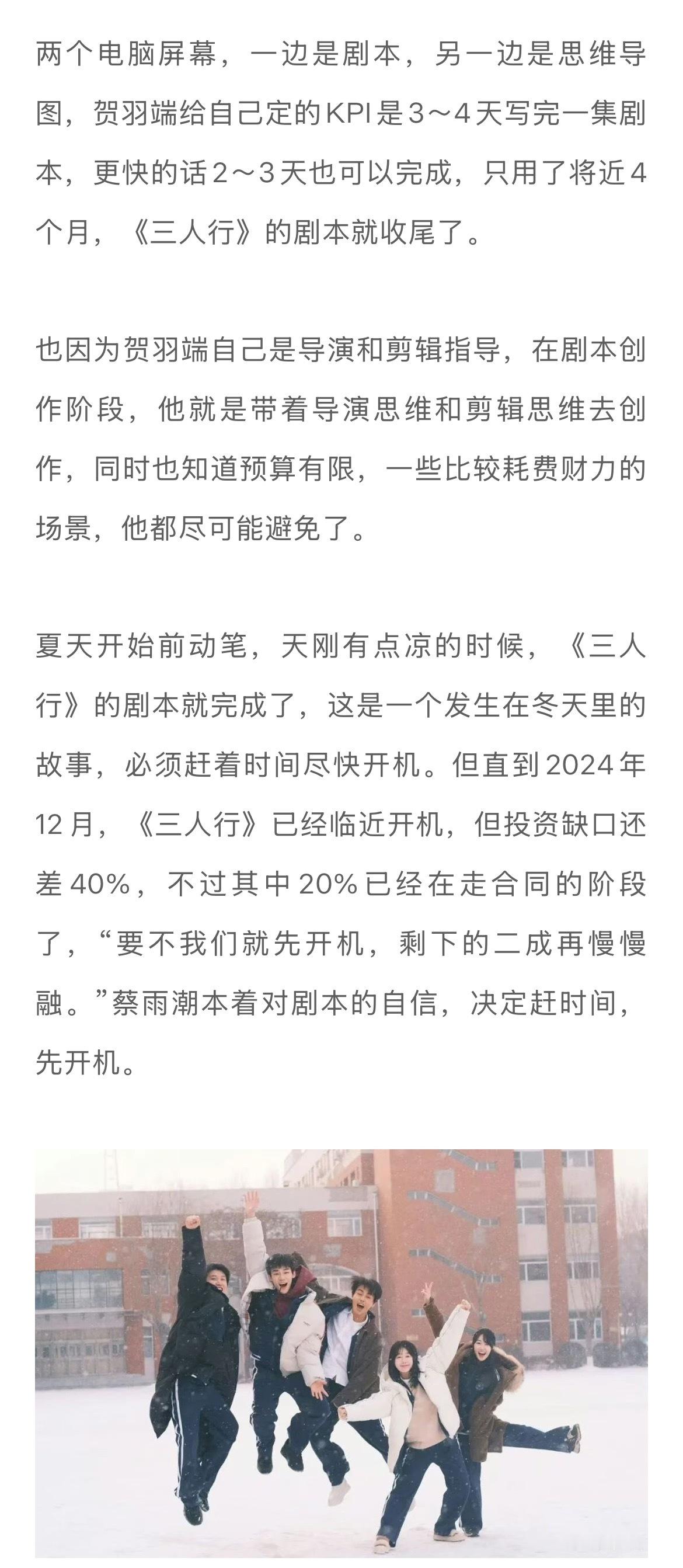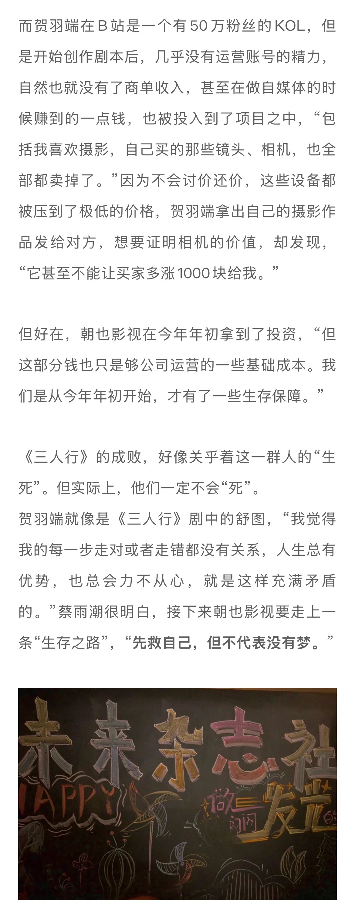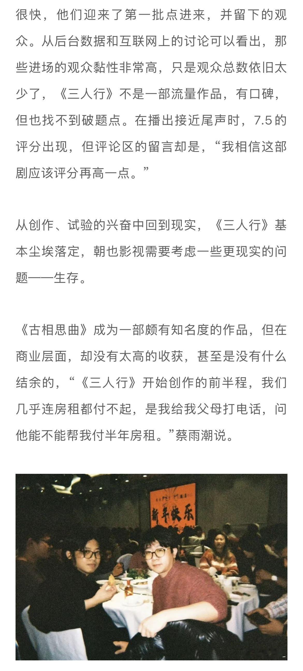 《古相思曲》出圈后,最先被认可的就是演员和导演,张雅钦、知竹都在近两年内有了长足的进步,能接触到的行业资源不断在攀升,编剧贺羽端也是如此,接到了很多大IP改编的邀约。但另一方面则是行业没有那么快认可整个制作团队的能力,而是想要不断拆解个人,让他们投入到其他的项目中。当时摆在朝也影视面前的有两条路,一条是让已经有了代表作的大家尽快投入到市场上各大头部影视剧项目中,各自片酬不菲,一定可以改善目前的经济状况。而另一条路就是再次集中力量,去博取更大的可能,让行业看到朝也这个团队的创作能力。贺羽端回忆当初时表示:“在这样的行业情况下,毕业就选择创业已经是一个非常大胆的决定了,《古相思曲》又给了我们这样的机会,我们没有理由不乘胜追击。”在这个以数据和结果为导向的大环境下,想让投资方为一个年轻的团队买单并不容易。但幸运的是,这个年轻的团队找到了合作伙伴风芒。此后,蔡雨潮和风芒分头行动,“我前后大概见了至少十几家投资公司,最后只有1~2家确定合作。”加上风芒找到的资方,最终也只有6~7家同意合作。但是开机第一周,全网热议的舆情事件爆发,影响越来越大,“那家在走合同的投资,就撤掉了。”《三人行》一下子出现了巨大的资金缺口,再加上临时换演员,年轻的团队被现实狠狠地抽了一巴掌。影视行业的“抵押”也可以是“作品”:“当时我们聊了一家,也算是朋友愿意帮忙,鹤鹤答应给对方写30集的剧本,用未来的片酬来抵押。”除了贺羽端,朝也影视的全部员工参与这部剧都是没有任何酬劳的,这部分钱全部按照比例加入了前期的投资款中,就这样算上借款、片酬参投等等,朝也的投资比例逐渐走高,成为第一出品公司,背起了最大的风险。从创作、试验的兴奋中回到现实,《三人行》基本尘埃落定,朝也影视需要考虑“生存”之类的现实问题。虽然《古相思曲》成为了一部颇有知名度的作品,但在商业层面却没有太高的收获,甚至是没有什么结余的,蔡雨潮透露:“《三人行》开始创作的前半程,我们几乎连房租都付不起,是我给我父母打电话,问他能不能帮我付半年房租…”更多内容,请看新浪娱乐↓