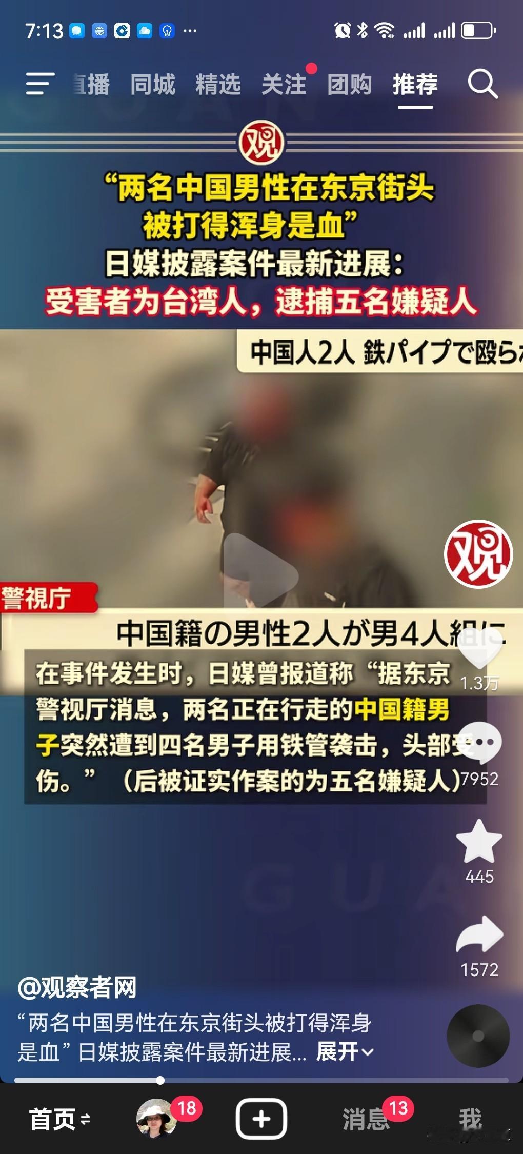 观察者网报道,两名中国男性在东京街头多人用铁管袭击,头部受伤,据称被打的浑身是血! 据报道被打两人来自中国台湾省。 国家发了旅行的警示,明确表示日本右翼袭击中国游客,建议不去日本,头铁不听话啊。还看了一些日本媒体在机场采访中国游客的视频。也没别的可说的,国家尽到责任了,自己的行为自己负责任吧!