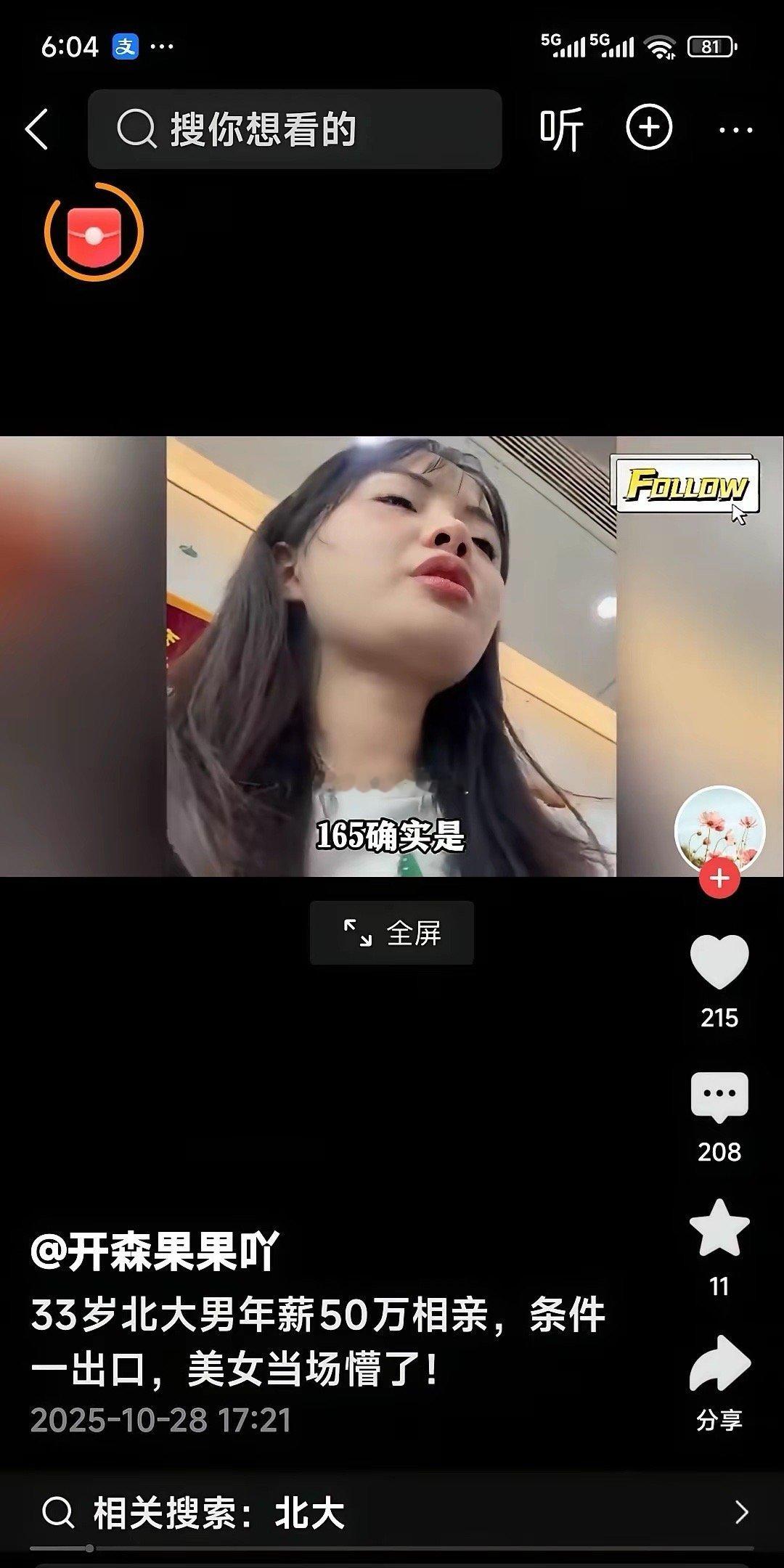 33岁北大男相亲开口就要女方是处女,年薪五十万也救不了这句翻车。网上爆料说,俩人刚坐下,男方先甩学历房子工资,女生点头觉得还行,结果他补一句“我结婚底线是处女”,女生当场愣住,直接拎包走人。帖子一出,评论区炸了,有人骂他披着精英皮的清朝人,也有人护“择偶自由”我看自由没错,可自由也得讲基本尊重,把隐私当门槛,还摆到桌面上,谁听了不膈应。高学历本该让脑子更亮,不是用来给歧视镀金的。挑伴侣不是选商品,条件列得再漂亮,缺了尊重只剩笑话。
