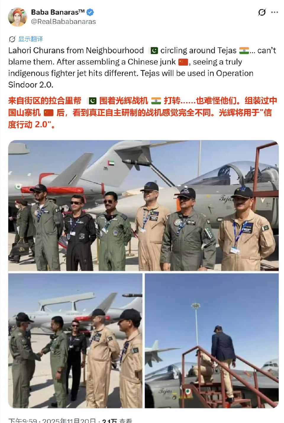 太尴尬了。就在迪拜航展的最后一天,印度国产的"光辉"战机当众摔了个粉碎。 当地时间11月21日下午两点多,这架正在进行飞行表演的战机突然失控坠毁,现场顿时浓烟滚滚。航展主办方不得不紧急叫停了后面的所有表演。最令人痛心的是,飞行员没能成功弹射,最终确认不幸遇难。救援直升机虽然很快赶到了现场,但事故原因还得等官方进一步调查。 其实这架战机在航展前几天就出过洋相。当时它在静态展示时被拍到机身漏油,地勤人员居然用购物袋和吸水垫在下面接油。这段视频在网上疯传,引来不少嘲讽。印度官方辩解说那是"冷凝水",但始终没拿出技术报告来证明。 这次坠机是"光辉"战机服役以来的第二次事故。去年三月就因为发动机油泵故障摔过一架,幸好当时飞行员成功跳伞了。这次装备的虽然是英国马丁贝克的零零弹射座椅,但飞行员最终没能逃生。到底是机身姿态问题、操作时机不对,还是系统本身有故障,现在都还不清楚。 "光辉"战机的老问题早就不是秘密了。这款战机整整研发了三十三年,直到2016年才交付,创下了三代机的最长研发纪录。单机成本高达六千八百万美元,国产化率却只有百分之三十五,发动机还得用美国的,雷达是以色列的。 印度空军自己对它也不太信任。今年五月印巴空战时,军方宁可用"阵风"和苏30MKI,也不愿意派"光辉"上场。 这次当众摔机,对印度的军工出口简直是致命打击。阿根廷本来还有点兴趣,现在估计要打退堂鼓了。越南等国也得重新考虑采购计划。相比之下,同场参展的巴基斯坦"枭龙"Block3刚拿了阿塞拜疆四十六亿美元的订单,中国的歼10CE也因为在实战中表现不错而备受关注。 网上已经炸开锅了。有人调侃说它是"见到枭龙吓到漏油坠机",购物袋接油的视频被戏称为"印度军工名片"。印度国内更是骂声一片,民众直呼这是"国家耻辱",反对党趁机质疑莫迪的"自力更生"战略彻底失败。 深究起来,"光辉"战机的问题是整个印度军工体系的缩影。去年八月就爆出过六架量产机居然没装发动机的丑闻。由于用了太多国家的技术,后勤维护成本高得离谱,单机维护费竟然是法国"阵风"的一点八倍。 在模拟对抗中,"光辉"对"枭龙"Block3的胜率还不到百分之三十五。印度空军内部报告也显示,因为数据链兼容性问题,这战机根本融不进现有的作战体系。 可以说,这次坠机不只是一起机械故障,更是印度军工研发低效、质量管控失败、供应链混乱的集中体现。在迪拜这个国际舞台上,"光辉"的接连失误,与中巴等国装备的成熟表现形成了鲜明对比。如果印度不能在核心技术上有所突破,那它国内七十多亿美元、九十七架的采购订单,以及所有的出口野心,恐怕都要泡汤了。