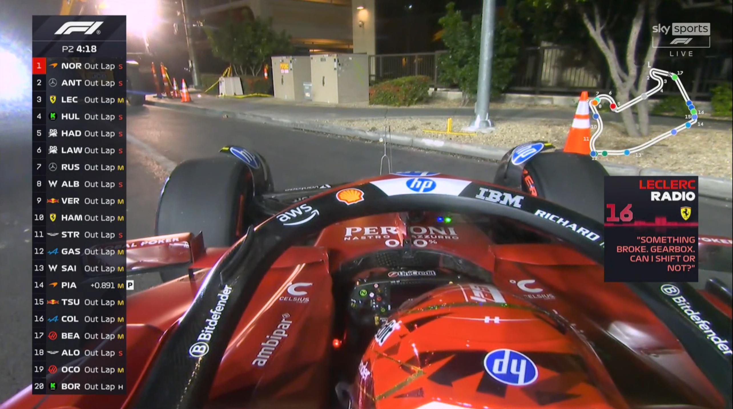 勒克莱尔的赛车变速箱出现故障,停在了赛道旁边刚刚比赛工程师波齐告诉他:不要换档
