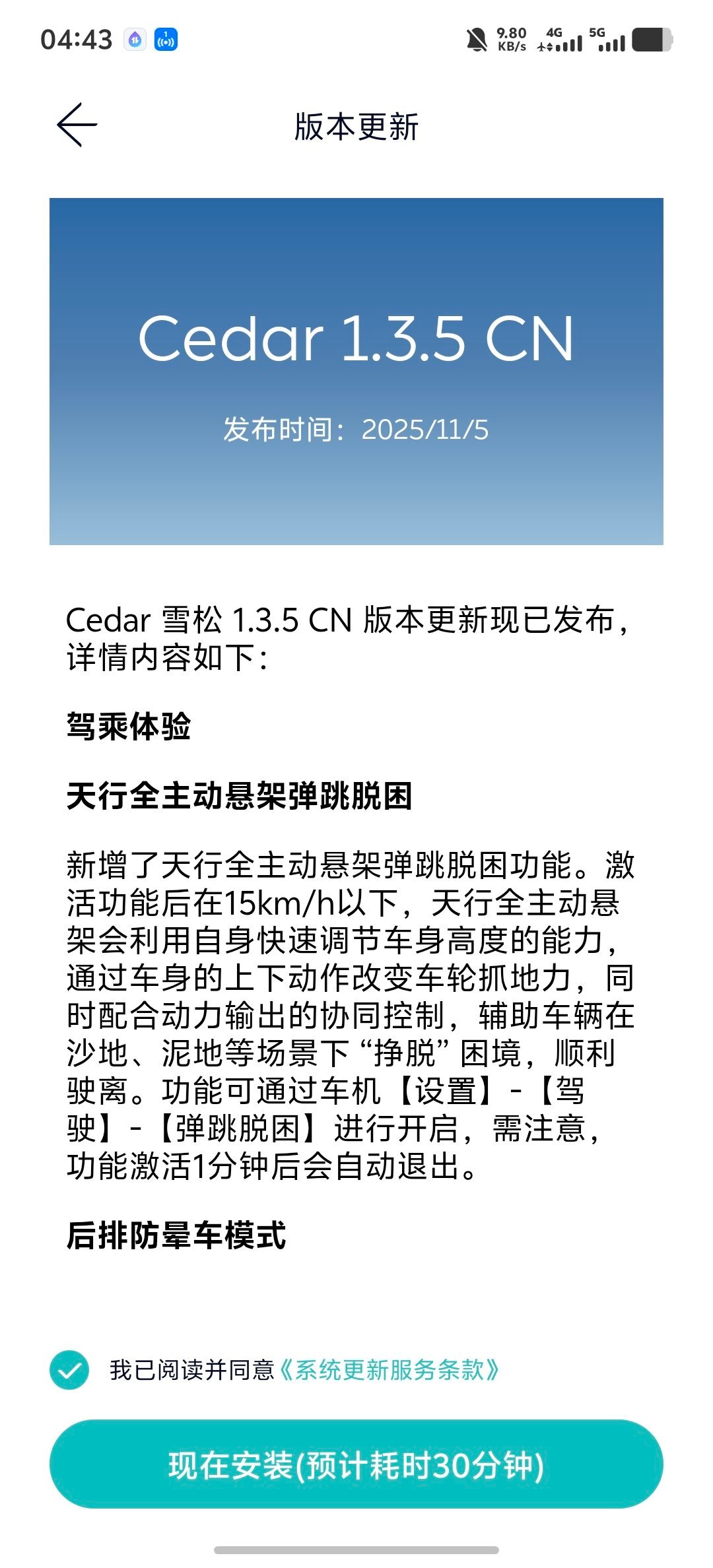夜里4点,突然醒了,生物钟略微紊乱。那更新个车吧ET9 Cedar 1.3.5来了,全主动悬架“跳一跳”脱困上线。全主动悬架拓展了车乘坐舒适的边界,也给更多超越时代功能提供了可能(比如被大车追尾前,主动抬高车尾 降低伤害)。加上最近更新了略显登味的外观,希望能让目标人群看到
