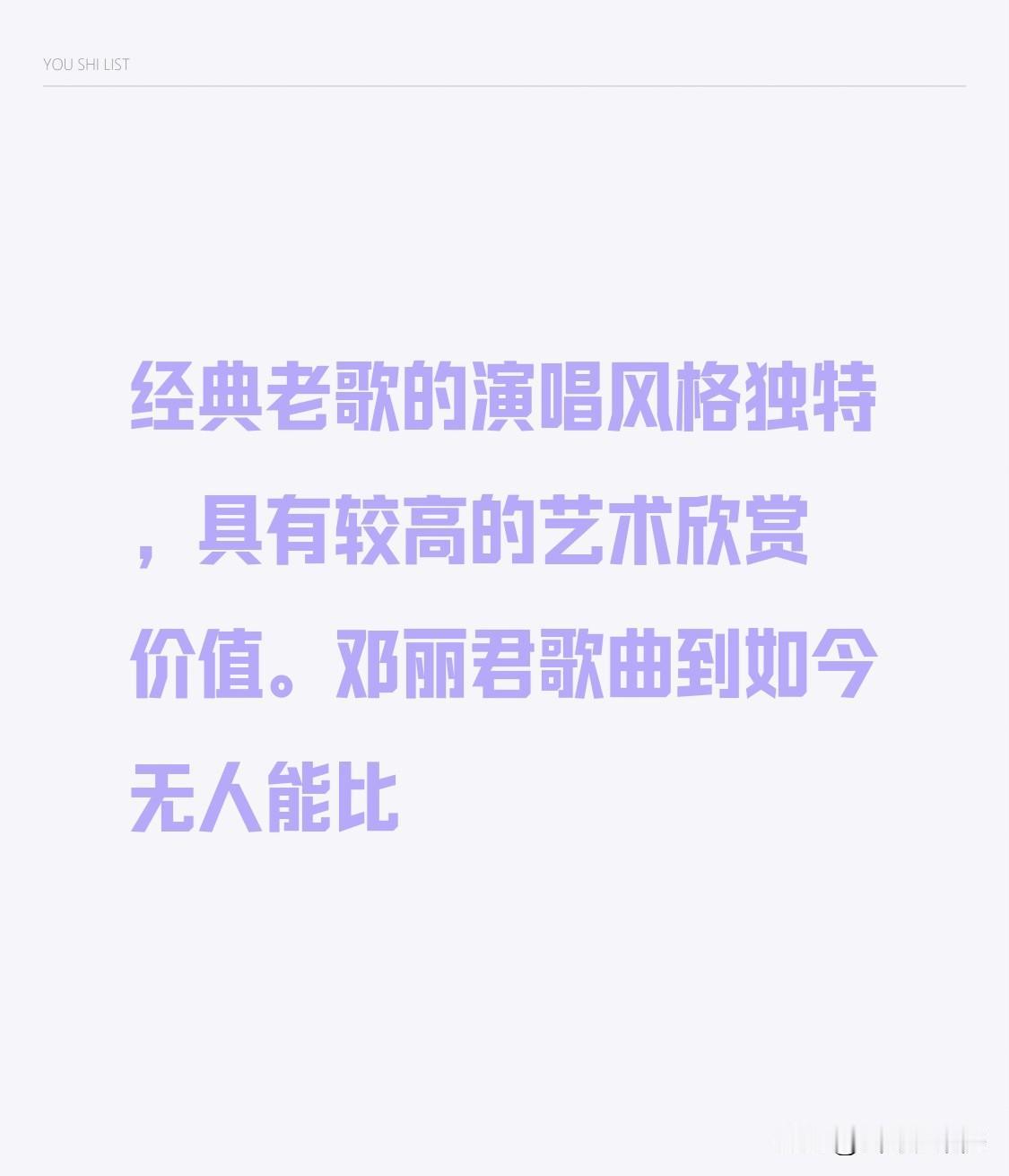 邓丽君的歌,真是经典中的经典,演唱风格独特,艺术价值超高,至今无人能比。她是80年代华语乐坛的一代歌后,还是首位登上美国林肯中心舞台的华人歌手。 像《我只在乎你》《月亮代表我的心》《甜蜜蜜》等,每一首都旋律优美、歌声动听。《但愿人长久》即便王菲翻唱,也难超邓丽君版本。她的歌声柔情似水、甜美深情,给人无限温暖。 可惜她英年早逝,带着对大陆的向往成了终生遗憾。但她在华语乐坛的地位无可取代,形象和风格早已深入人心。