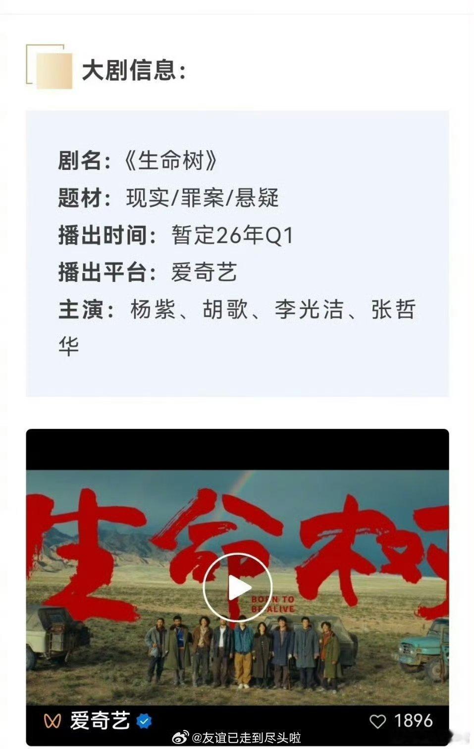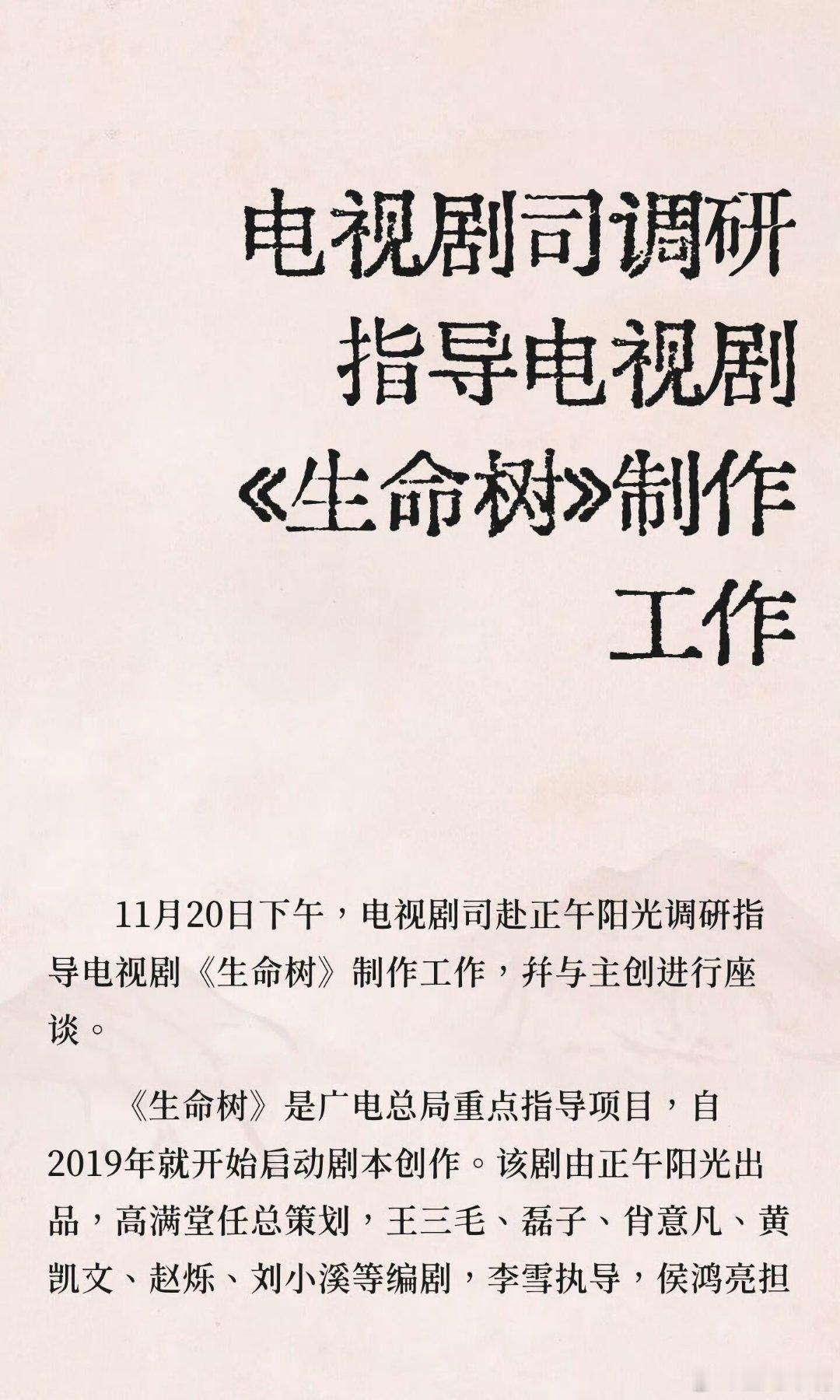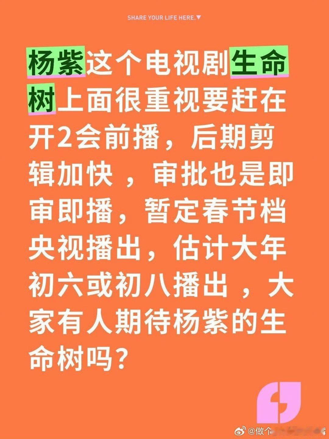 杨紫《生命树》排播Q1春节档!预计大年初六左右播出(2月下旬)!上面很重视,赶在两会前开播!目前《生命树》已经进入招商阶段!很快就会和大家见面!期待播出!