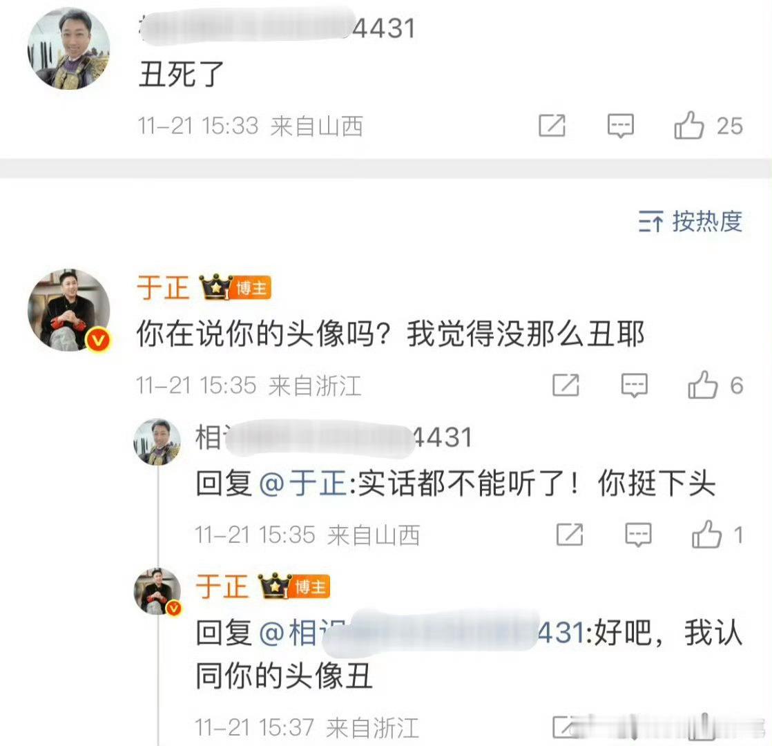 陈哲远粉丝回复于正的定妆照丑,于正回复说她的头像(陈哲远)丑,然后这位粉丝把头像换成了于正哈哈哈哈哈哈 什么时候拿出来看看都会笑出声
