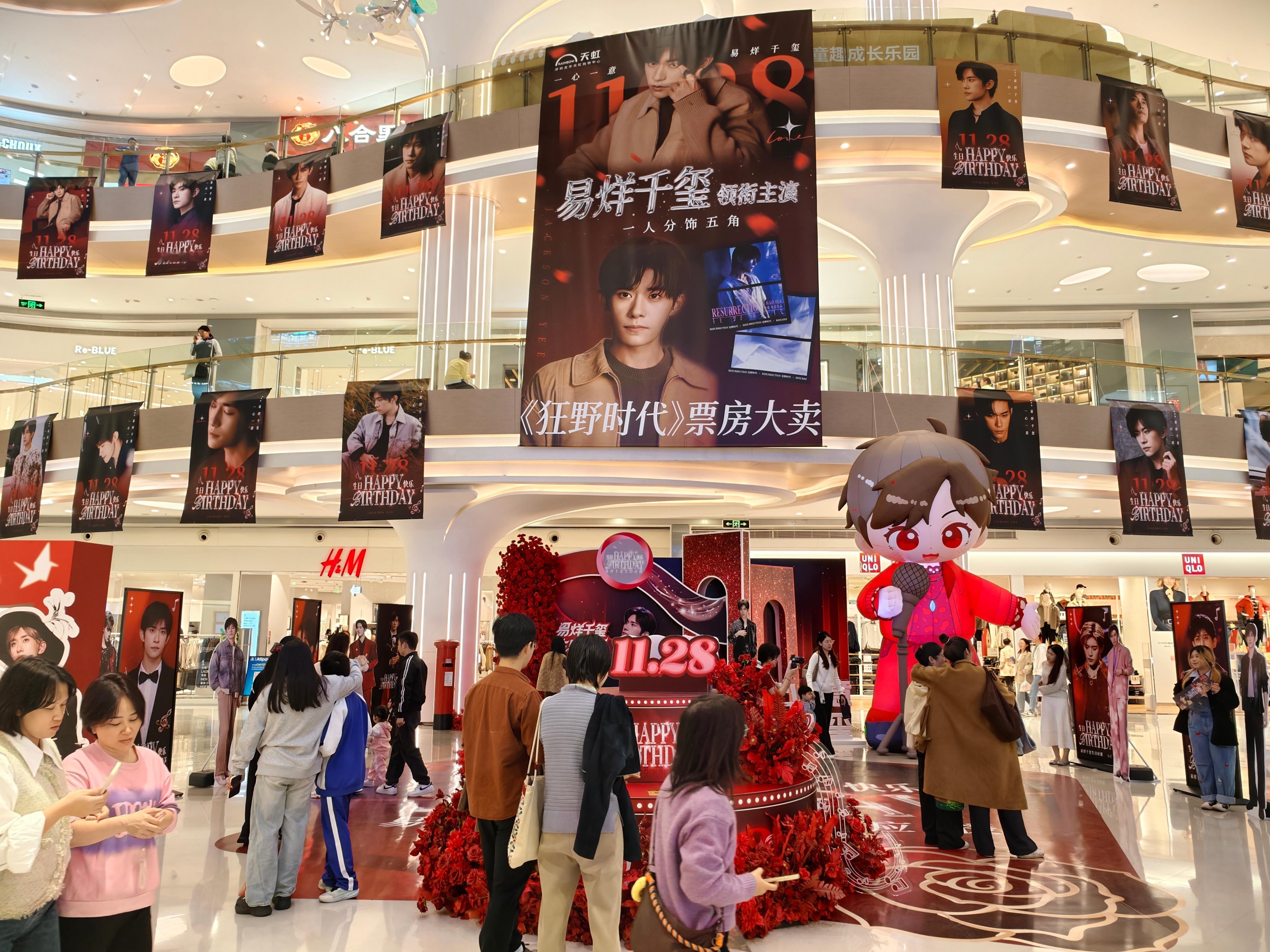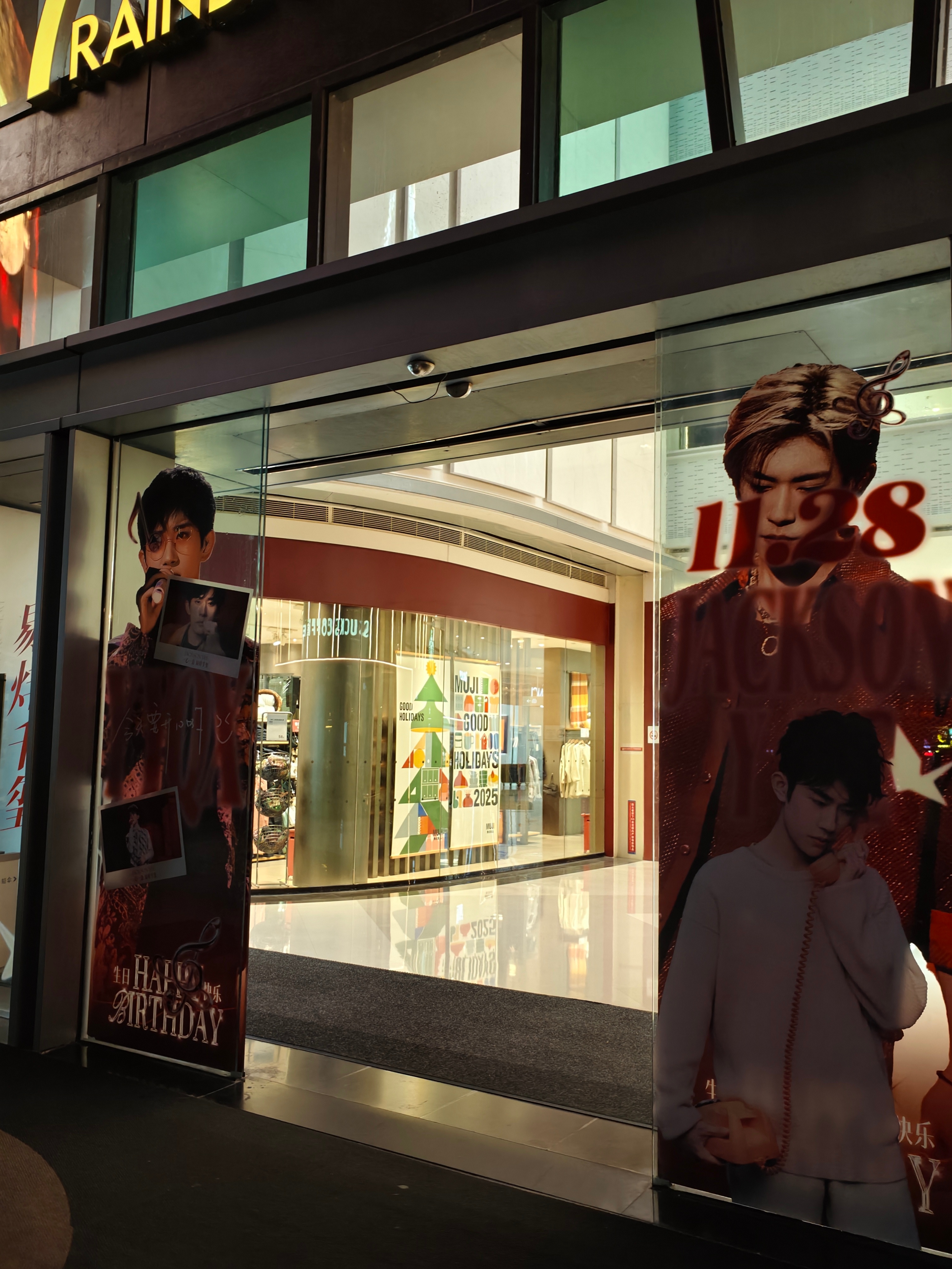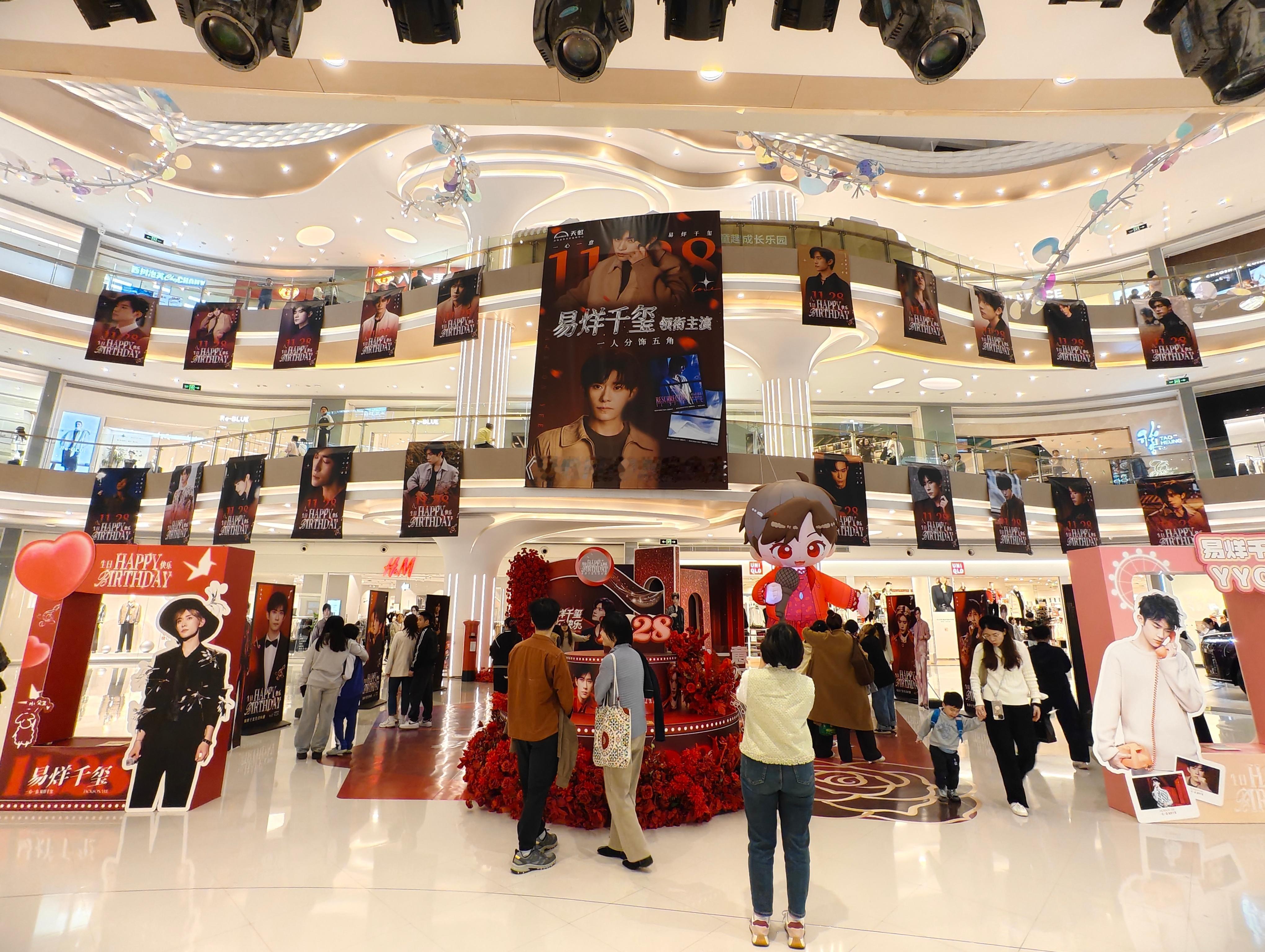 路过天虹购物中心,看到易烊千玺25岁生日主题痛楼,挺酷的。有巨型吊幅、花墙、全