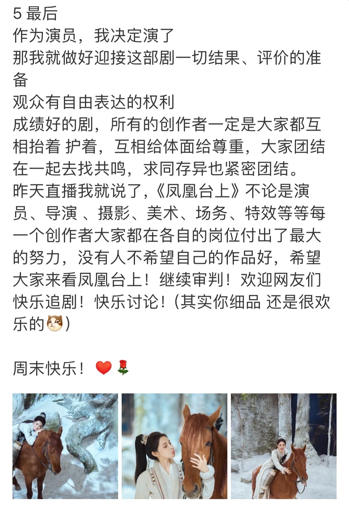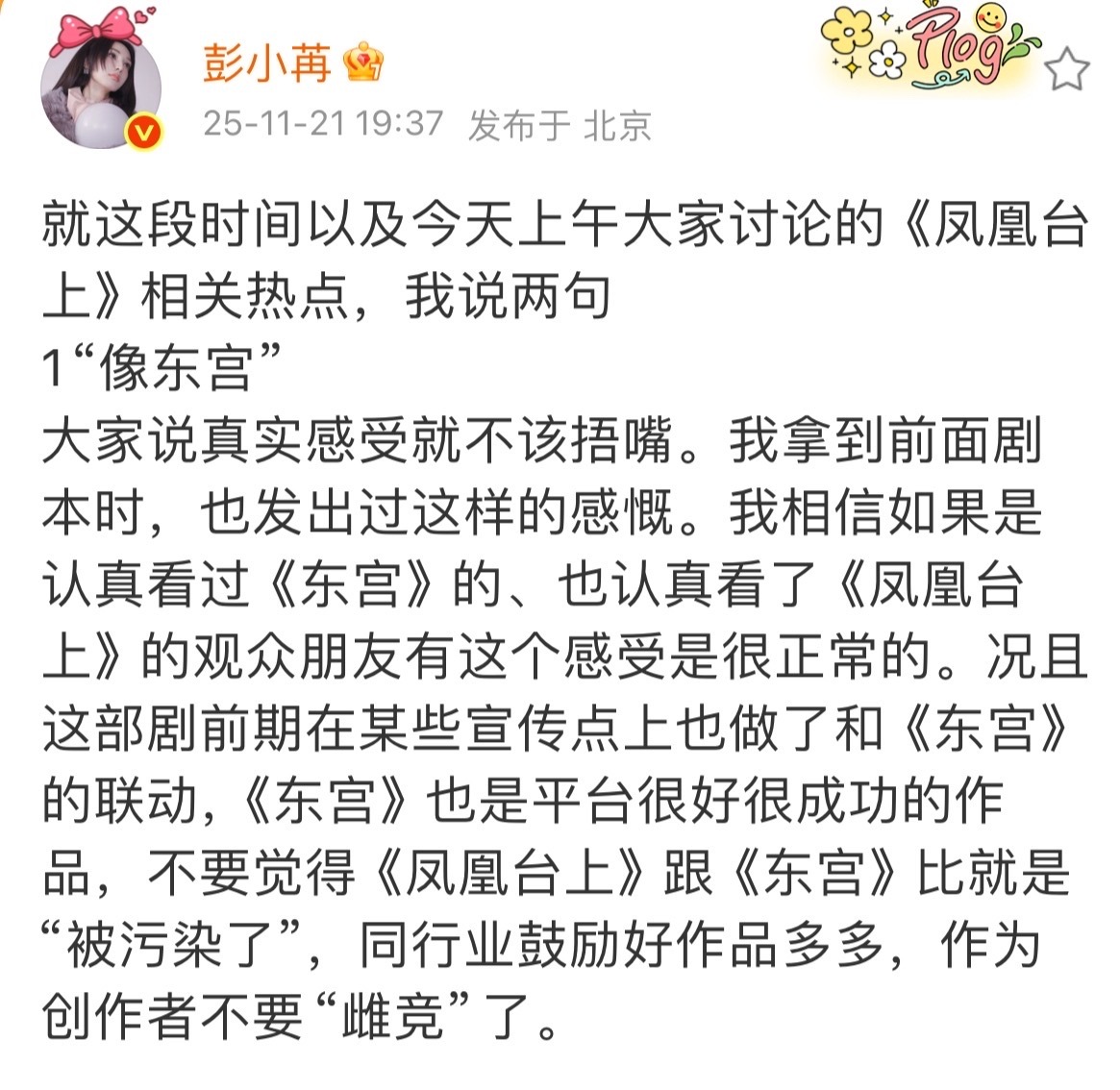 彭小苒发长文回应凤凰台上像东宫,还说开拍前只收到1集定稿剧本,只能说男女主都被做局了、