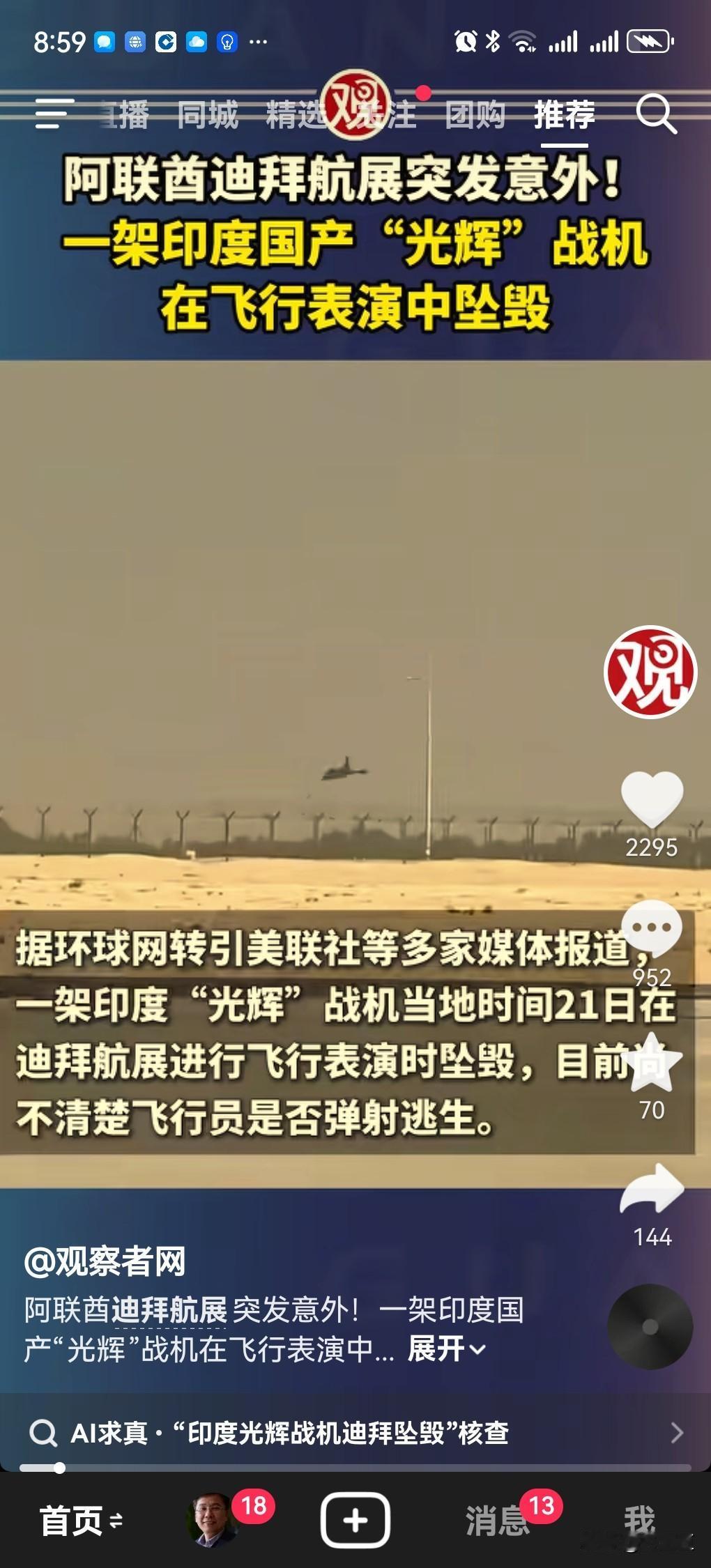 显眼了吧?这会这眼显到国外去了,而且还是直播,这巴拉特赢学可咋解释? 环球网报道,印度一架光辉战机在迪拜航展表演时坠毁了 前几天有报道说光辉漏油了,它否认,这众目睽睽的掉下来了,没法否认了吧! 就这个还号称吊打歼二十?真是春秋美梦!