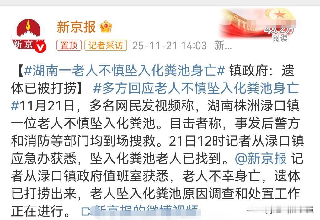 这真的是太悲剧了。 11月21日,多名网友发视频称,湖南株洲一老人不慎坠入化粪池身亡。 这真是防不胜防啊。 毕竟这样的事故也是报道过很多了。 那一掉进去,那真的是凶多吉少了。