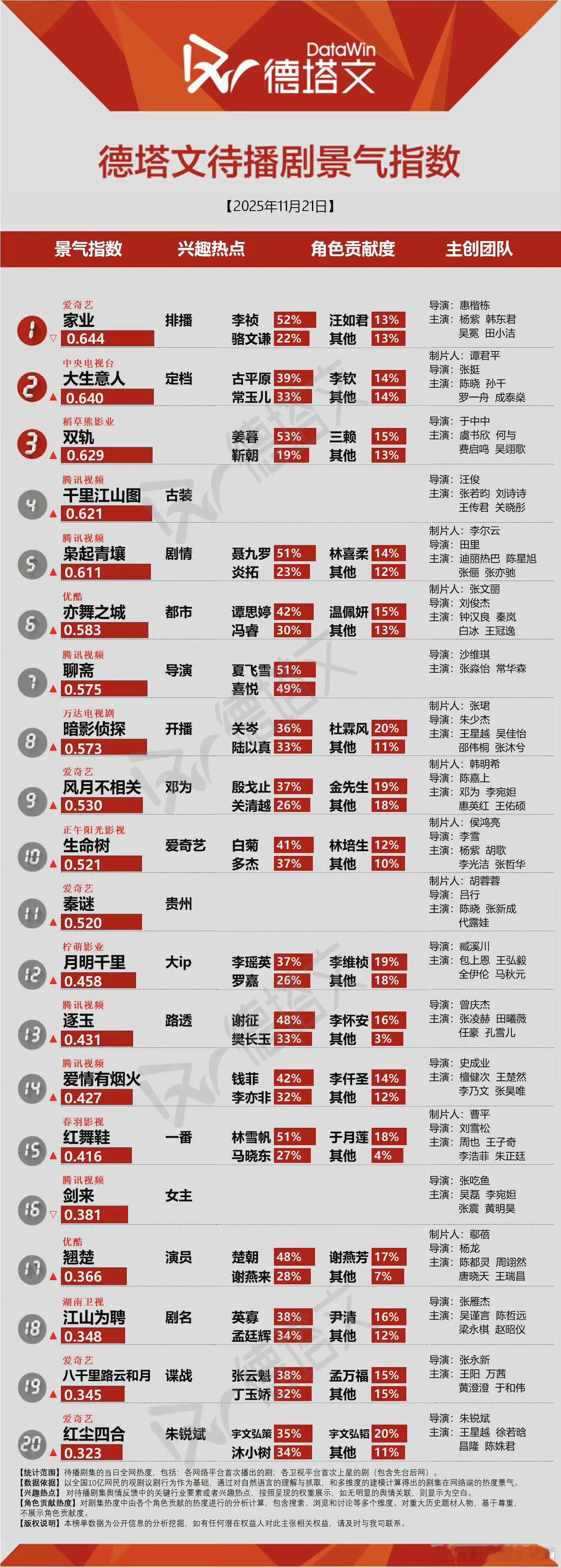 德塔文景气指数只有唐诡3一支独秀破2,唉,太低迷了。待播剧景气指数,家业啥也没有为啥登顶了?哦,各种排播瓜层出不穷,今天还刷到一个自称独家瓜的说生命树和家业不会连播的。就,瓜主真的好容易当啊。