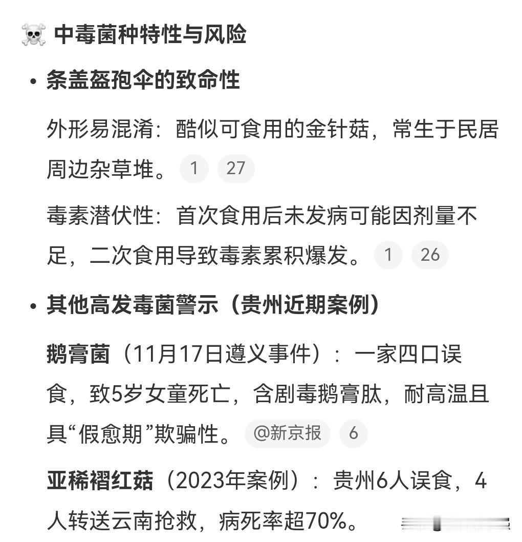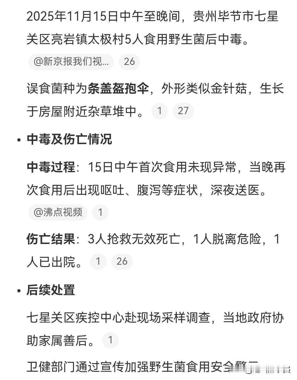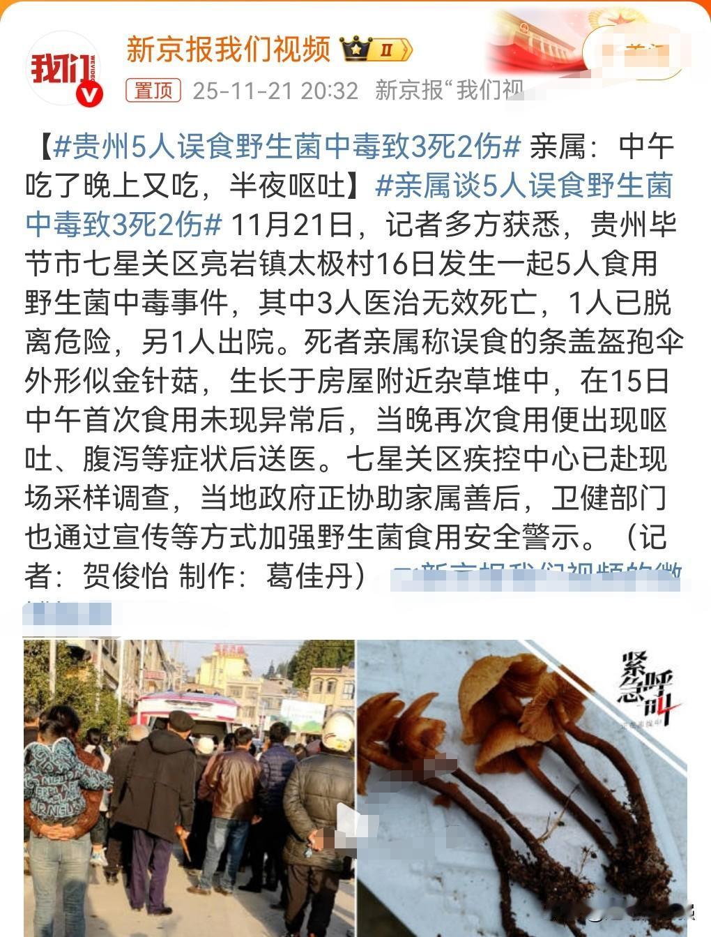 这真的是太悲剧了,真是敲响了警钟。 不认识的蘑菇千万不要采来吃。 近日,贵州5人误食野生菌中毒致3死2伤。 采摘的蘑菇有点像金针菇,但是颜色不像,金针菇是白色的。 像这样的悲剧也不是一起两起了。 还是要管住嘴。
