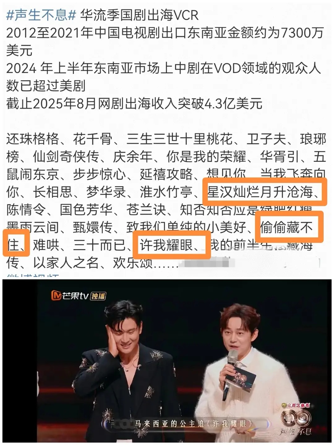 《声生不息华流季》提到出海成功剧集赵露思一人占3部,特别提到马来西亚公主追《许我耀眼》…👍偷偷藏不住 星汉灿烂 许我耀眼三部上榜