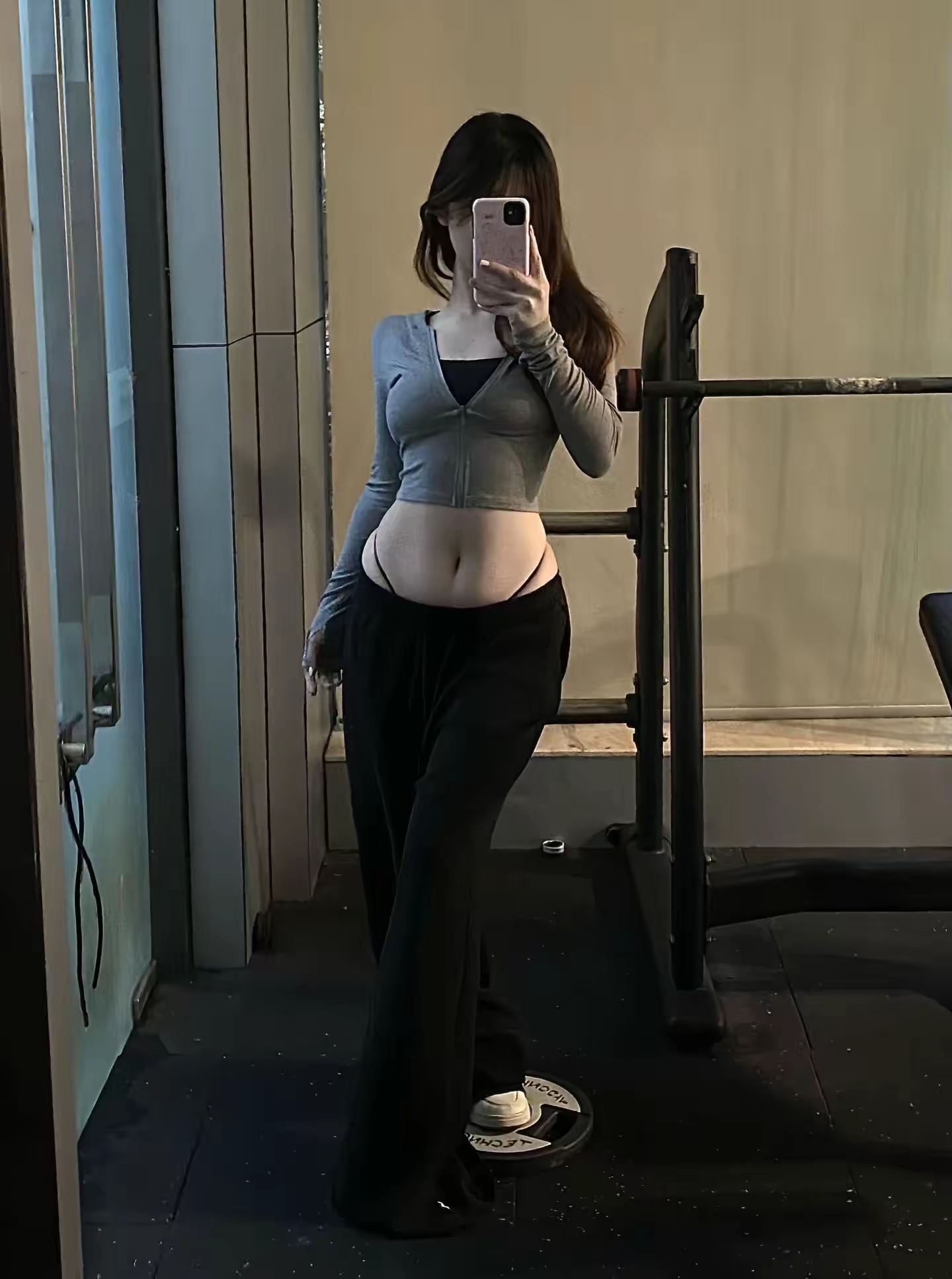 在健身房自拍的女生,身着灰色短款拉链上衣与黑色阔腿裤,展示不同角度的身材状态,从腹部有赘肉到练出明显腹肌,呈现健身前后的变化,展现对身材管理的努力与成果。丁字裤很迷人灰色紧身裤穿搭 健身穿搭 美女 健身房日常穿搭 露脐装自拍 健身女春天穿搭 运动健身裤穿搭 健身裤美女 灰色阔腿运动裤