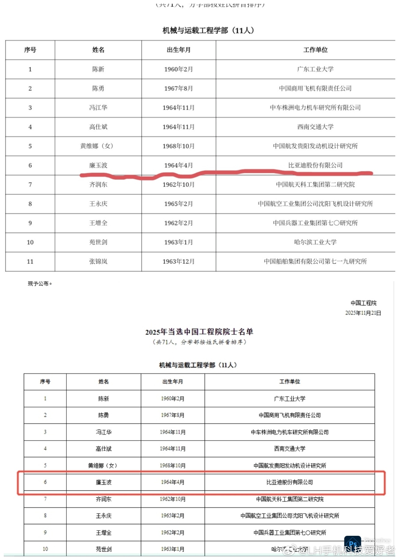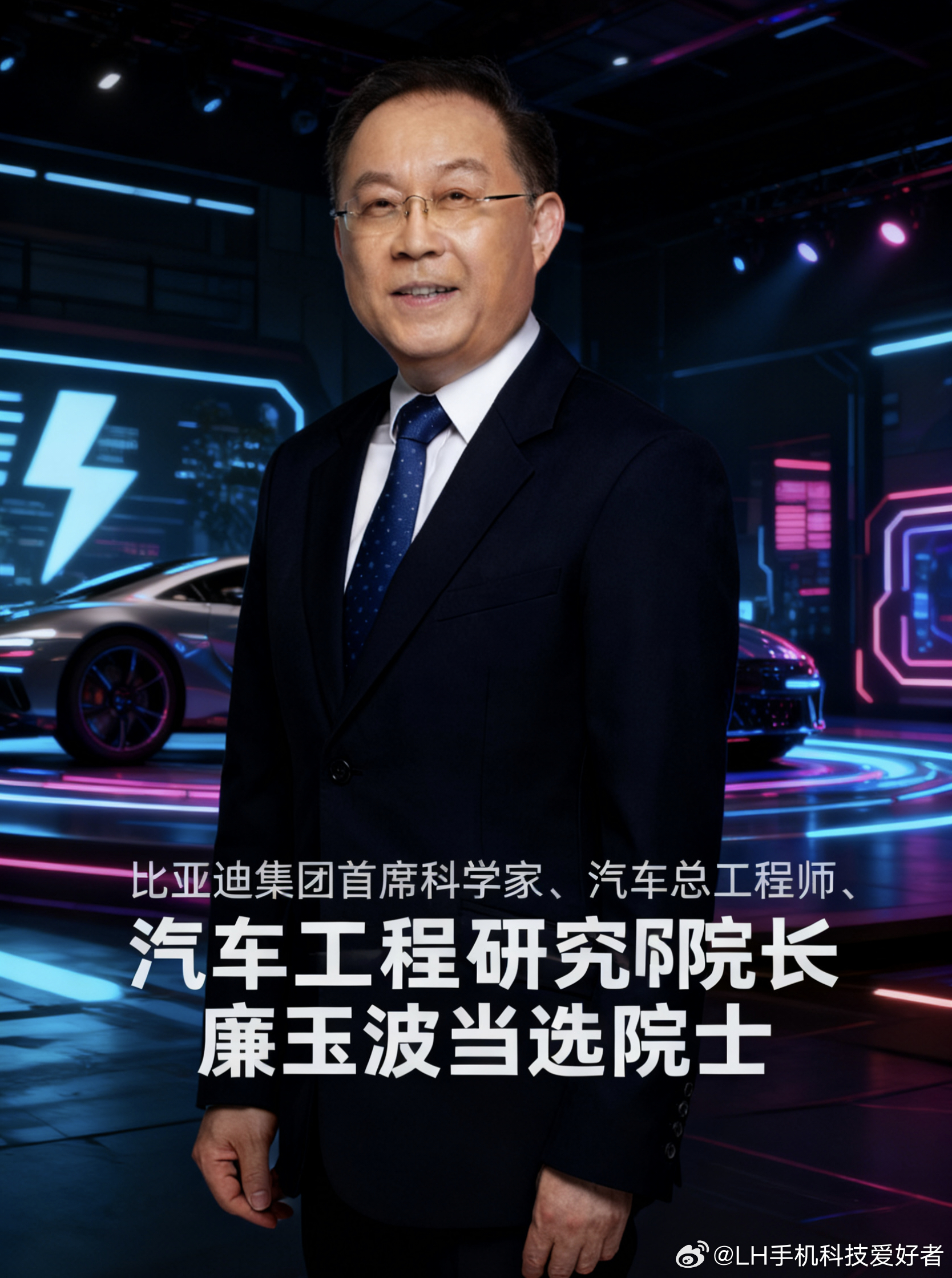 给各位迪粉们带来一个好消息,廉总被正式评为院士了。2025 年 11 月 21 日,中国工程院公布了 2025 年院士增选结果。点进去看了一下,比亚迪集团首席科学家、汽车总工程师、汽车工程研究院院长廉玉波当选中国工程院院士。之前有很多迪粉包括群友,都在盼着廉总能评为院士,如今也是如大家所愿了。要知道,院士是我国科学技术方面和工程科技领域的最高荣誉称号。能获此殊荣,说明廉玉波对新能源汽车行业做出了重大贡献,以技立身荣膺院士,比亚迪能有今天的成就也离不开廉总的付出。技术为王,创新为本,这个是比亚迪的发展理念,看看现在的汽车市场,十几年前谁能想到这一切?总之,这是实至名归,也是对廉总的认可。
