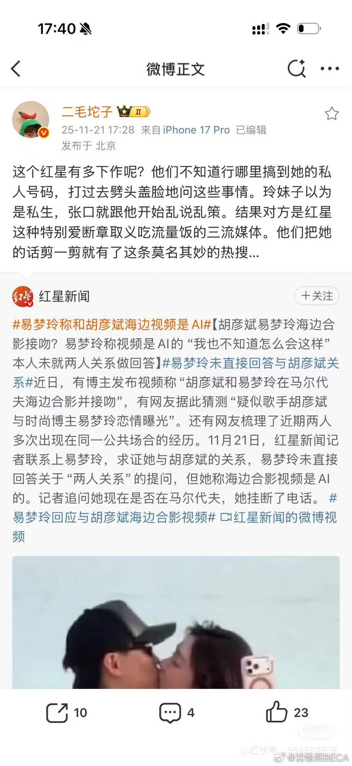 抓马,下午易梦玲辟谣和胡彦斌亲吻是AI,晚上胡彦斌就要求社交媒体发一发,告诉他们不是AI的” …… 看来是易梦玲不愿意公开,胡彦斌想公开,所以胡彦斌抓住机会要名分了,但看照片易梦玲也挺开心的,并没有不想公开。 也有人说易梦玲之所以说是AI,是因为红星不知道哪里搞到她的私人号码,直接打过去劈头盖脸问,易梦玲以为是私生,直接张口就跟他胡说八道,结果被剪一剪打出来了。 如果是真的是这样,那这些媒体还怪可怕的,有渠道弄到别人的私人号码,为什么不等人家当事人自己澄清或者公开,要搞这种手段骚扰别人,这也太不光明了,有些媒体要点脸吧!