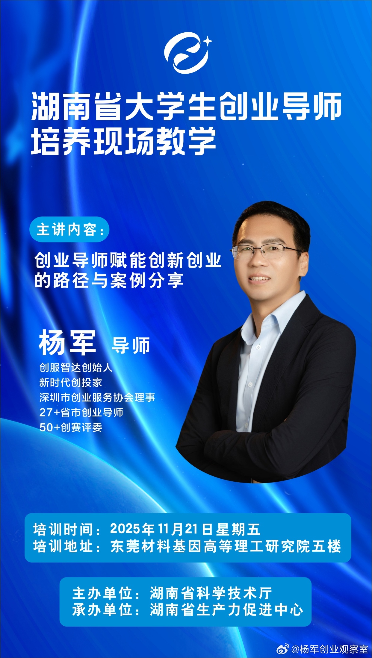 创服智达杨军为“湖南省大学生创业导师”主讲《创业导师赋能创新创业的路径与案例分享》与近40位一线导师们共同探讨如何以实战经验、资本思维和生态资源,精准助力大学生创新创业。感恩湖南省生产力促进中心的精心组织和东莞博士科技的引荐,期待与更多导师携手,让创业导师的“灯塔效应”照亮更多青年创业者的星辰大海创业导师赋能 创服智达