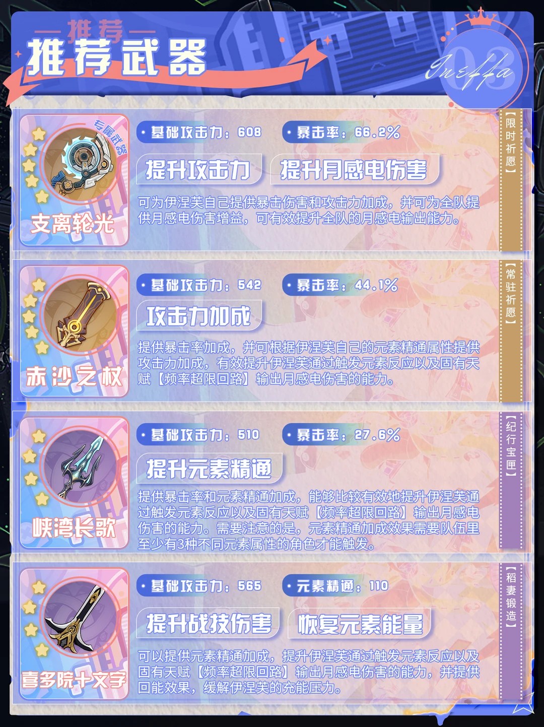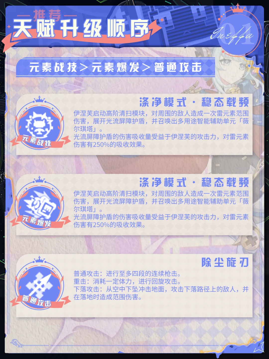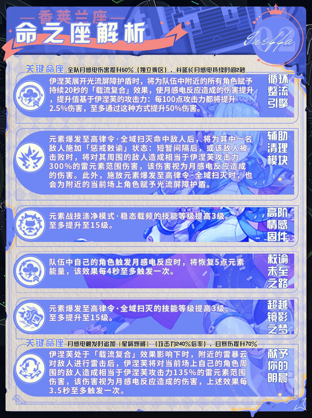 伊涅芙展开光流屏障护盾时,将为队伍中附近的所有角色赋予持续20秒的「载流复合」效果,使月感电反应造成的伤害提升提升值基于伊涅芙的攻击力:每100点攻击力都将提升2.5%伤害,至多通过这种方式提升50%伤害。