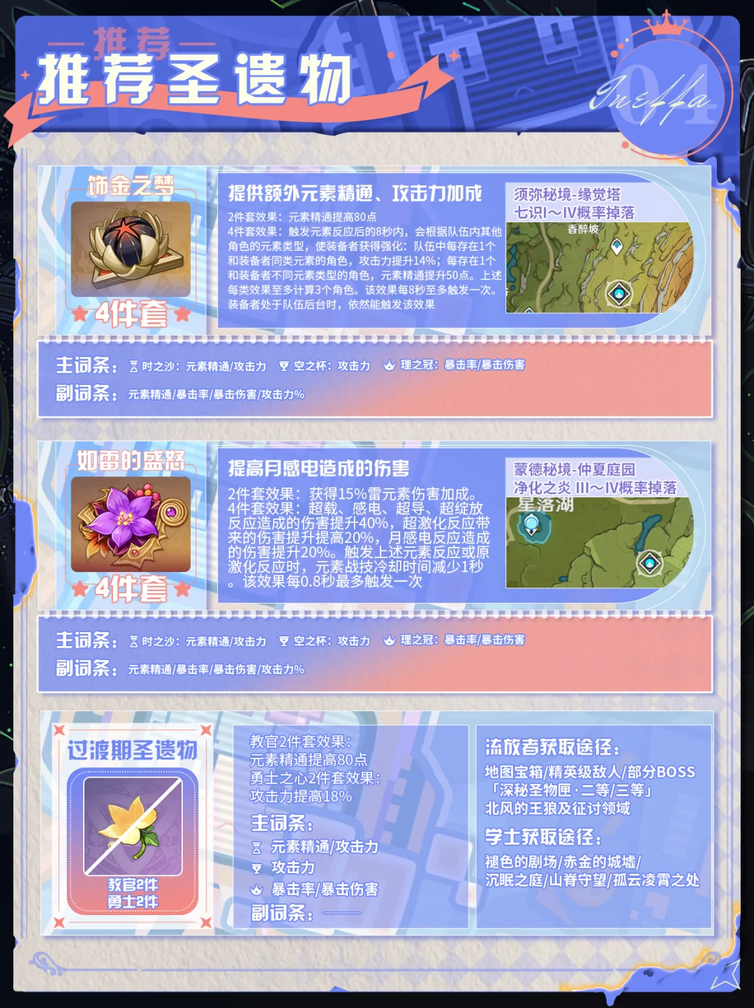 2件套效果:元素精通提高80点4件套效果:触发元素反应后的8秒内,会根据队伍内其他角色的元素类型,使装备者获得强化:队伍中每存在1个和装备者同类元素的角色,攻击力提升14%;每存在1个和装备者不同元素类型的角色,元素精通提升50点。上述每类效果至多计算3个角色。该效果每8秒至多触发一次,装备者处于队伍后台时,依然能触发该效果