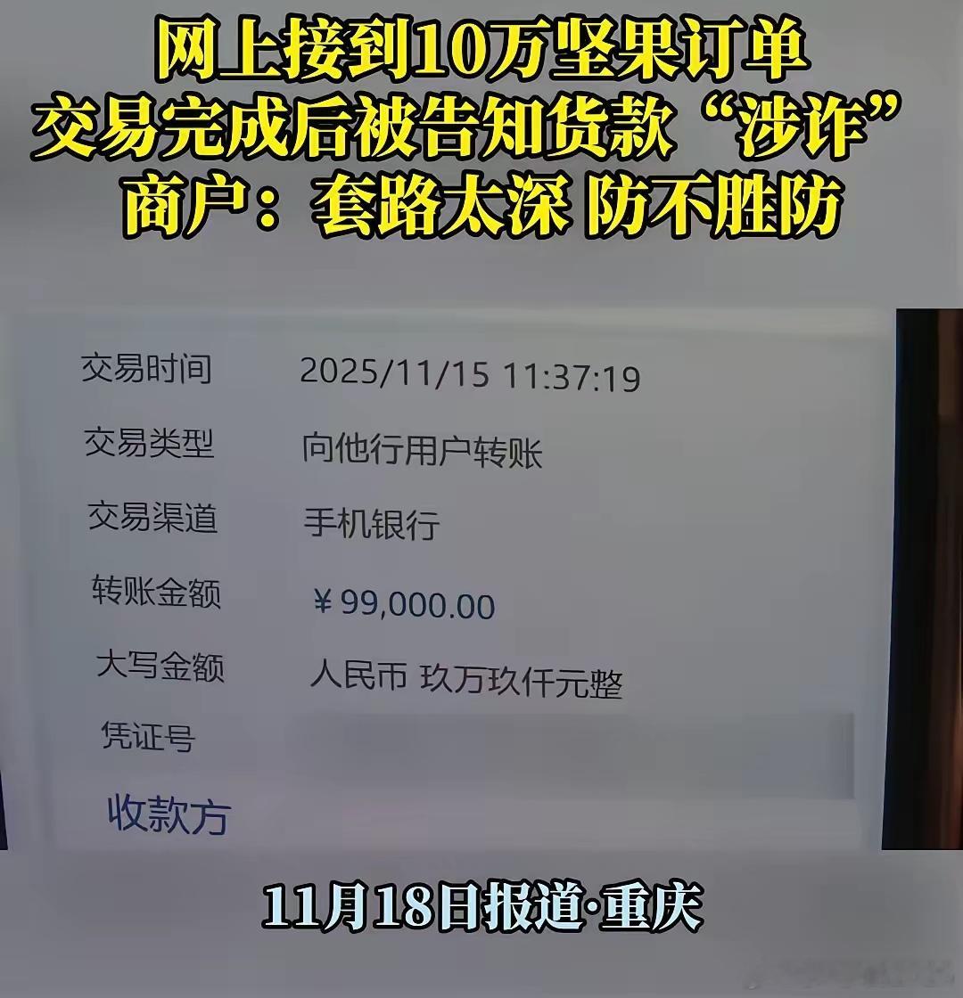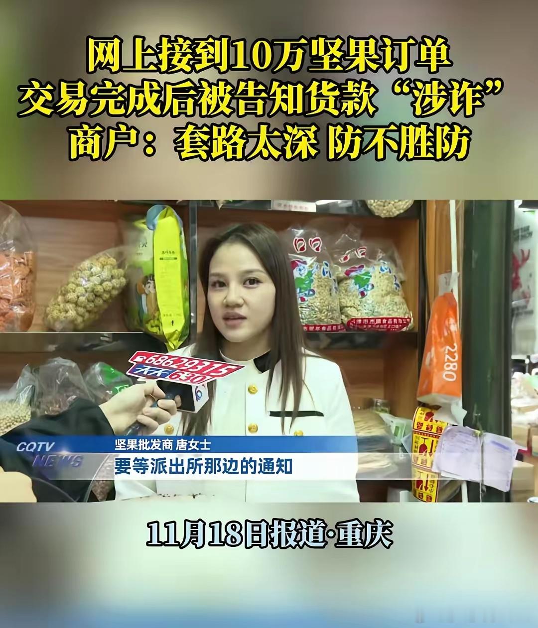 “我怎么知道他钱干净不干净?”重庆,女子在网上接到 10 万坚果订单,对方付钱后就让货拉拉把货运走,可她还来不及高兴,几个小时后银行卡就被冻结了,警方说女子收到的货款是涉诈资金!女子:“我就正常做生意,货没了,钱没了,我冤不冤?”唐女士和父母一直做着坚果批发生意,他们家向来都是一手交钱一手交货。像货被拉走、银行卡还被冻结这种事儿,他们还是头一回碰到。事情得从11月13号说起。有个网名叫“淡泊明志”的人加了唐女士好友,说自己要批发几十件坚果。唐女士一看,这可是笔大生意,心里顿时激动起来,便耐心地给对方介绍自家的货物。对方并没有马上就下单,而是让唐女士先寄样品看看货。唐女士见对方好像挺懂行的,也没多想,就把样品寄了过去。对方收到样品后,说货没问题,要进货,还直接跟唐女士要了银行卡号,转了99000元过来。钱到账后,唐女士特别开心,一点都没起疑心,马上就把货物准备好了。对方称自己没空来取货,叫了个货拉拉司机来运货。唐女士核对了司机的车牌,把货物装上了车,还拍了照,然后就让司机把货拉走了。唐女士正沉浸在做成一笔大单的喜悦中,可几小时后,她用来收款的银行卡却被外地警方冻结了。警方告知她,她收到的是涉诈资金。原来,那个来买坚果的人根本不是什么进货的商户,而是个骗子。他们骗了一个受害者,让受害者把钱直接转到唐女士的银行卡里,骗唐女士说是他们转的进货的钱。唐女士收到钱后就把货给了骗子,骗子拿到货后转手就卖掉变现了。这样一来,钱没经过骗子的账户,警方追踪骗子的线索就变得困难了。而货拉拉司机的卸货地点在一个马路边,线索又断了。唐女士都被这事儿弄懵了。现在正是坚果销售旺季,做批发一般都是几十件几十件地发货,而且对方在交易前的表现也没什么不合常理的地方。她觉得要是问人家钱是哪儿来的,会很尴尬,别人也不会和你说,所以问了也是白问。如今,大笔货款被冻结,生意的资金周转都成了问题,她心里觉得特别冤枉。而且,不止唐女士一个人遭遇了这种事。她在市场上打听了一圈,发现遭遇类似情况的商户已经有七八家了,涉及的资金将近百万元。目前,商户们都在等警方的调查结果,他们也想通过媒体提醒同行们,一定要提防类似的套路,免得惹上麻烦。警方在打击诈骗犯罪时面临追踪困难的问题,可这不能成为让无辜商家承担损失的理由。相关部门应该进一步加强对资金流向的监管和预警机制,不能让商家在毫不知情的情况下成为诈骗链条中的“背锅侠”。商家们也得提高警惕,不能仅仅因为怕尴尬就放弃对资金安全的基本审查,大单生意转转,一定要签订合同,要求购货人本人银行卡转账,毕竟生意场上,资金安全永远是第一位的。
