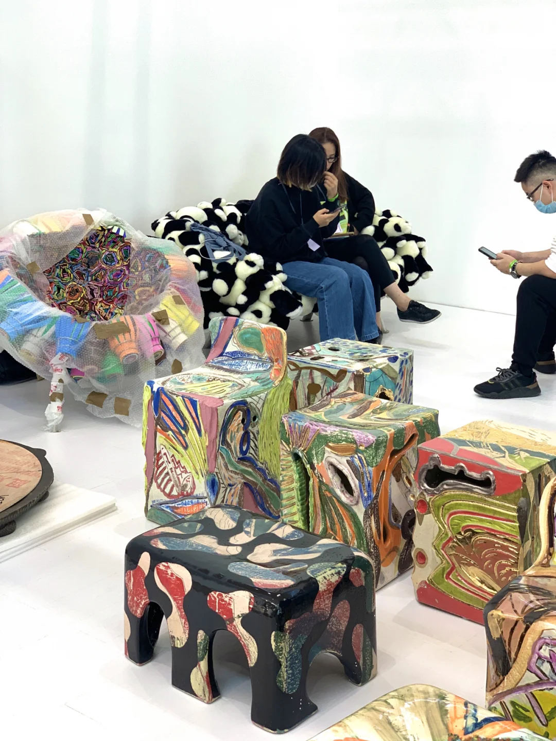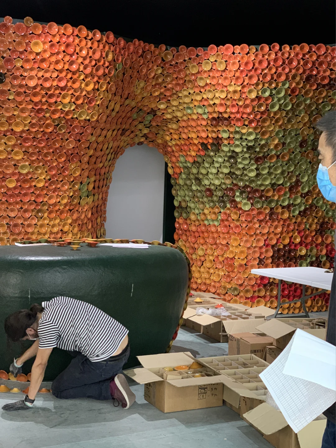 今年外国艺术家和画廊因为疫情原因数量比较少,但是我们展位旁边就有一对外国艺术家,做了瓷碗墙,很有意思!