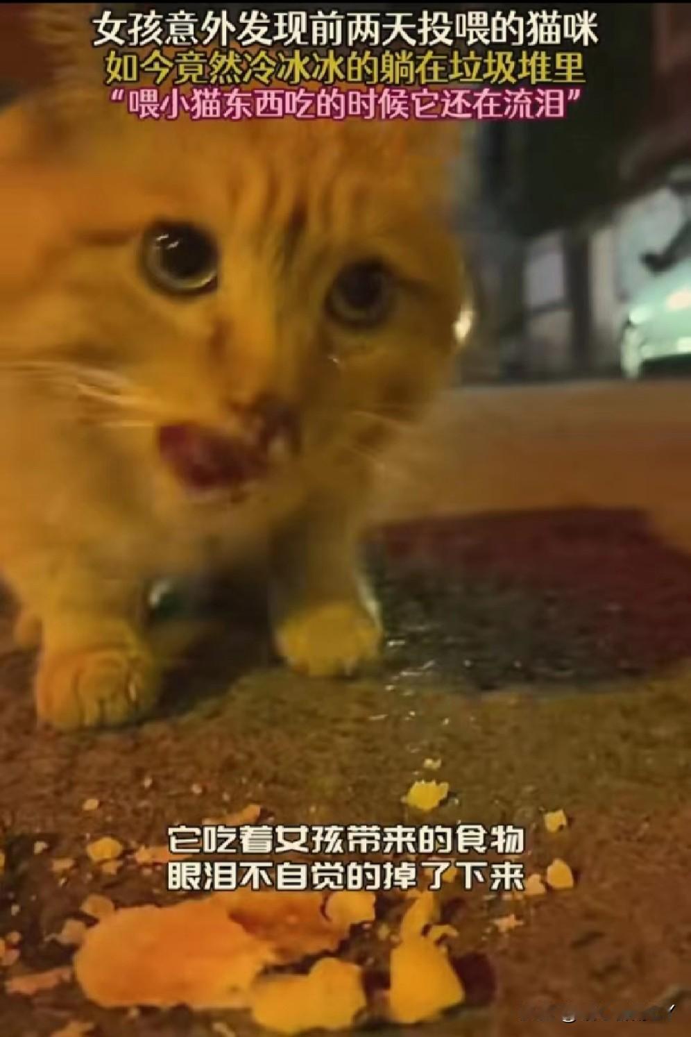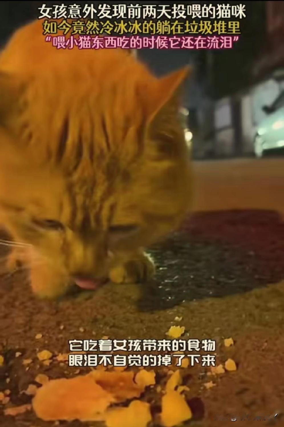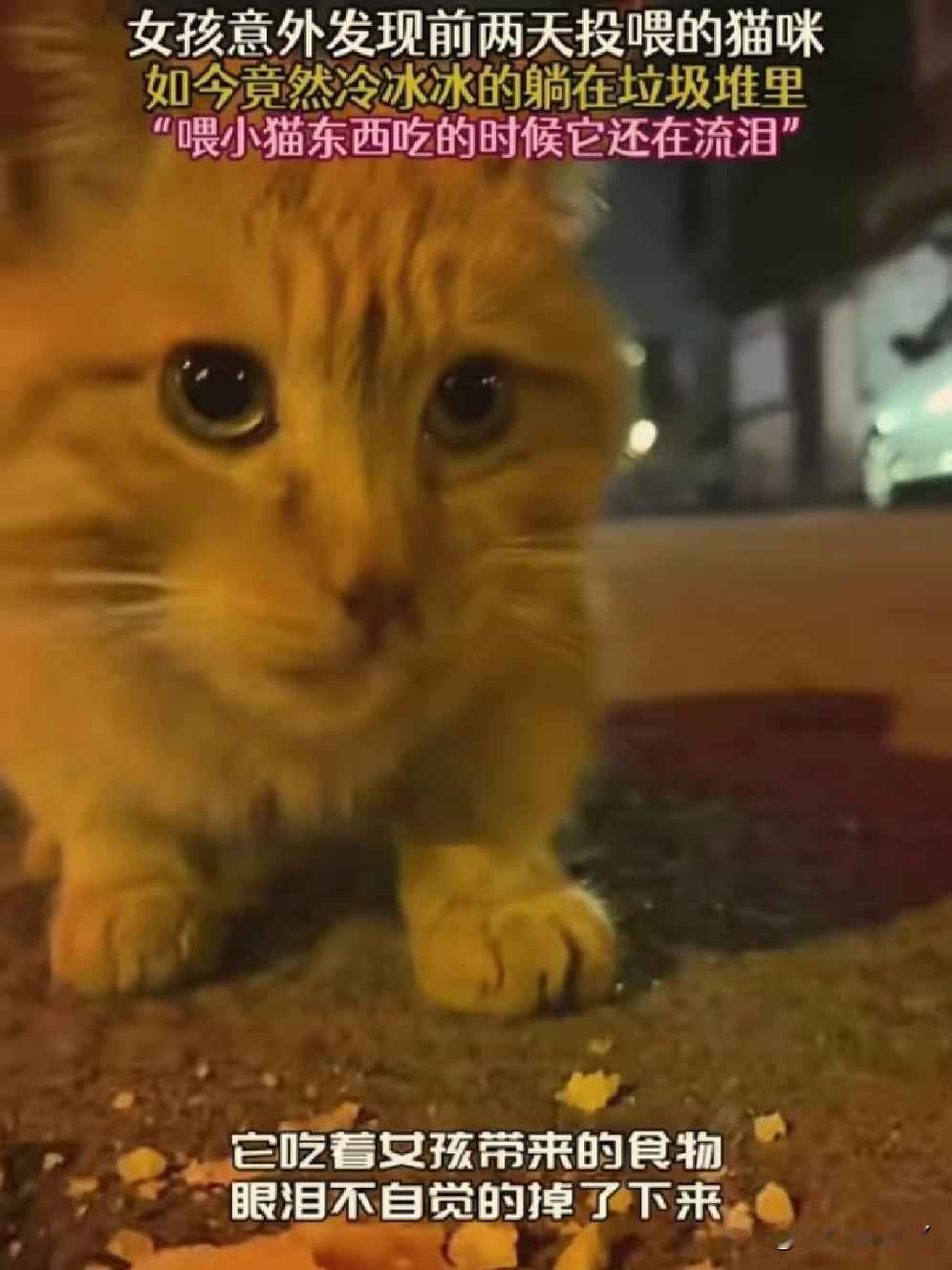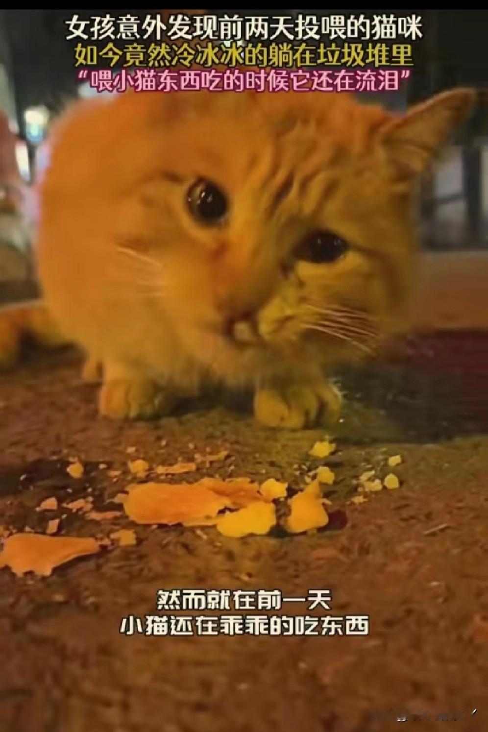 流浪猫的短暂温暖与猝然离别,看哭了谁? 前两天,那只流浪橘猫还在享用女子投喂的食物,边吃边泪眼汪汪。可今天,它却冷冰地躺在了垃圾堆里。 记得前一天晚上,它怯生生地吃着女子带来的食物,大眼睛里的泪却止不住的流,女子轻声安慰它慢慢吃,承诺以后常带好吃的给它。那一刻,它好像体会到了被爱的滋味。 可是第二天,女子满心期待地带着罐头去找它,看到的却是它在垃圾堆旁没了生气的模样。 它还没来得及好好感受这世界的善意,就匆匆去了喵星~ 流浪动物的生命太过脆弱,每一次投喂带来的温暖,都可能是它们生命中的光,可这光却如昙花一现、转瞬即逝…… 愿它在喵星不再流浪,也愿每一只流浪动物都能寻觅到属于自己的温暖小窝。创作训练营开营啦冬日生活打卡季 流浪猫