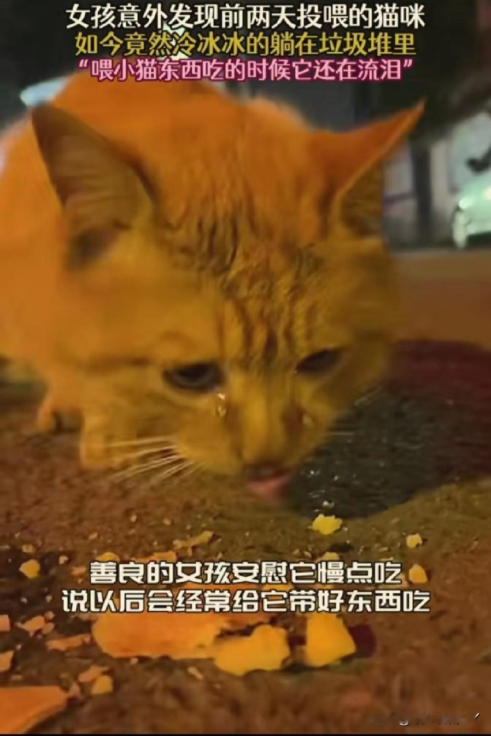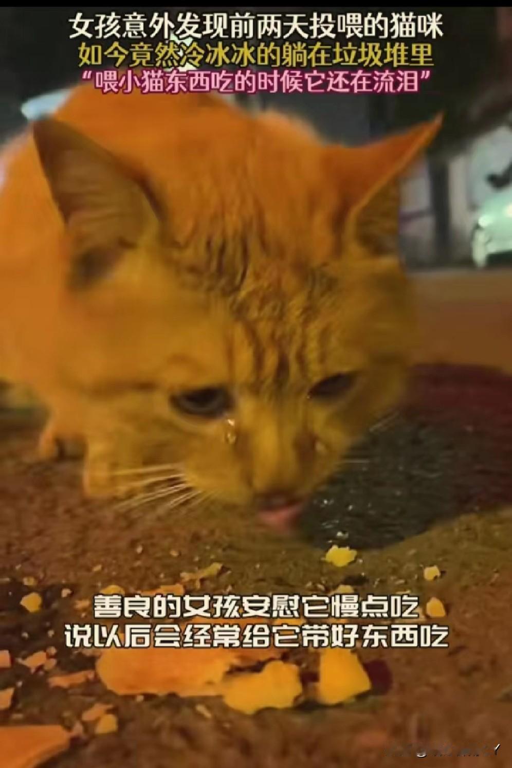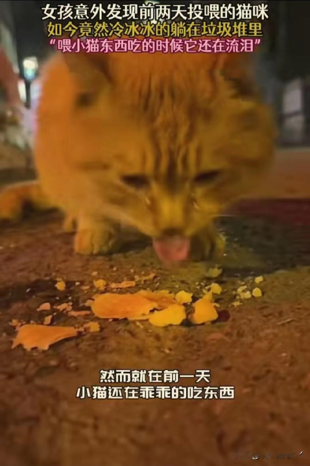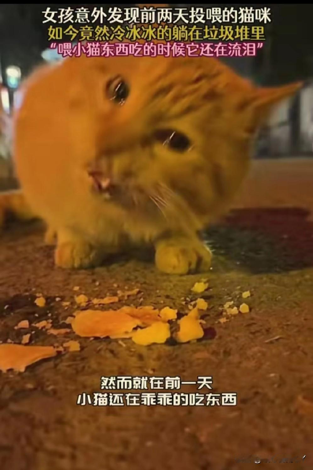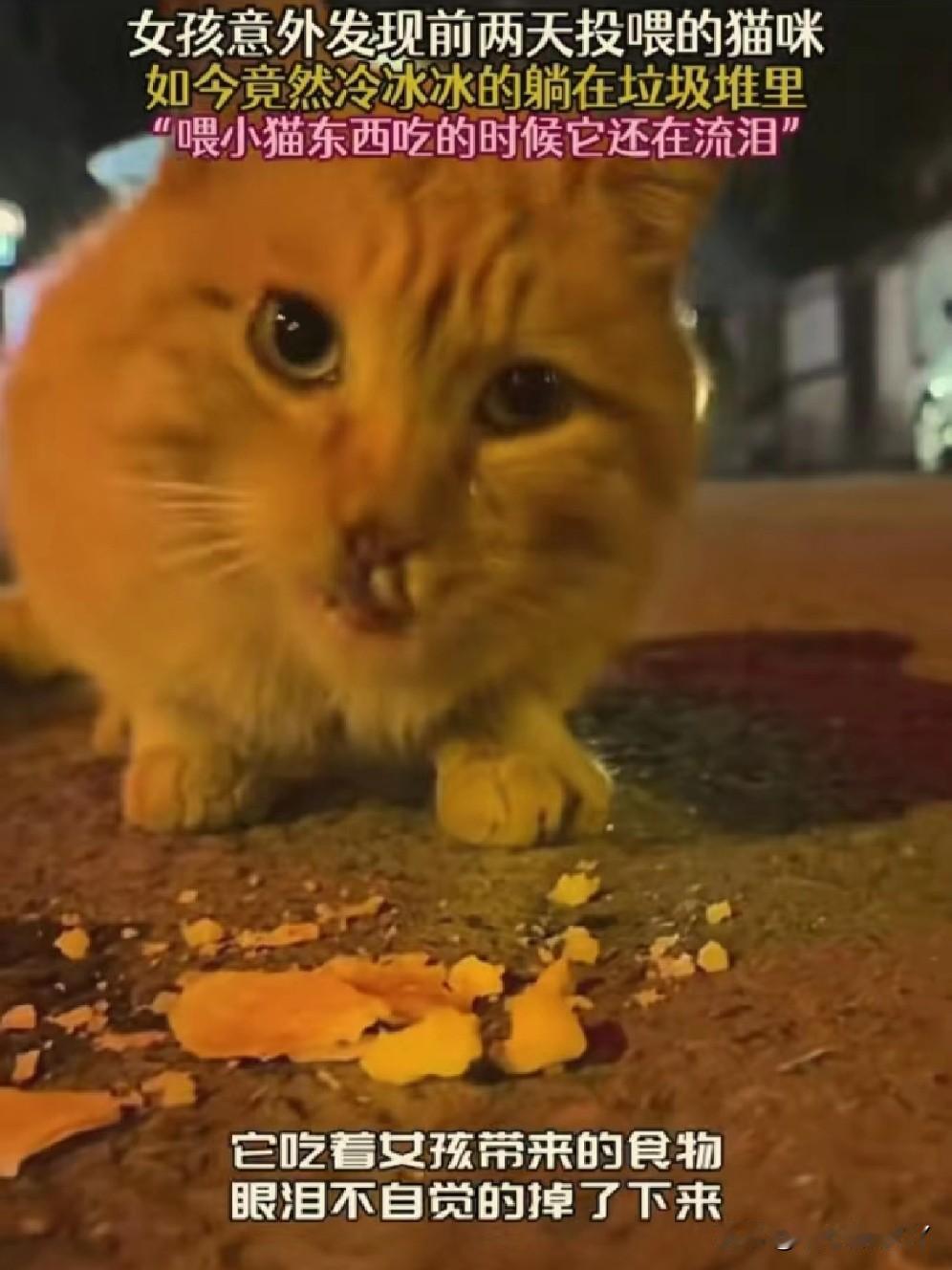 流浪猫的短暂温暖与猝然离别,看哭了谁? 前两天,那只流浪橘猫还在享用女子投喂的食物,边吃边泪眼汪汪。可今天,它却冷冰地躺在了垃圾堆里。 记得前一天晚上,它怯生生地吃着女子带来的食物,大眼睛里的泪却止不住的流,女子轻声安慰它慢慢吃,承诺以后常带好吃的给它。那一刻,它好像体会到了被爱的滋味。 可是第二天,女子满心期待地带着罐头去找它,看到的却是它在垃圾堆旁没了生气的模样。 它还没来得及好好感受这世界的善意,就匆匆去了喵星~ 流浪动物的生命太过脆弱,每一次投喂带来的温暖,都可能是它们生命中的光,可这光却如昙花一现、转瞬即逝…… 愿它在喵星不再流浪,也愿每一只流浪动物都能寻觅到属于自己的温暖小窝。创作训练营开营啦冬日生活打卡季 流浪猫