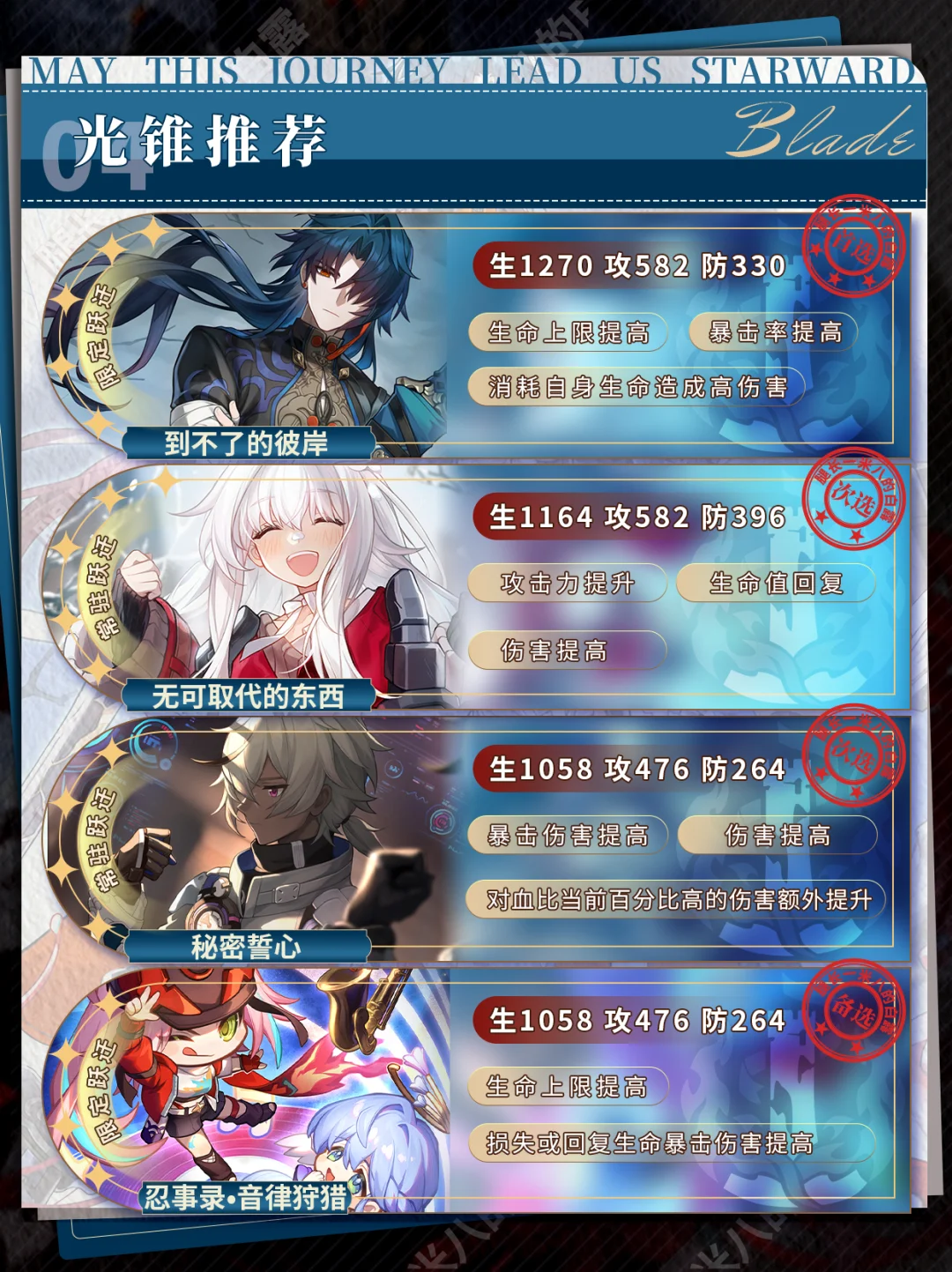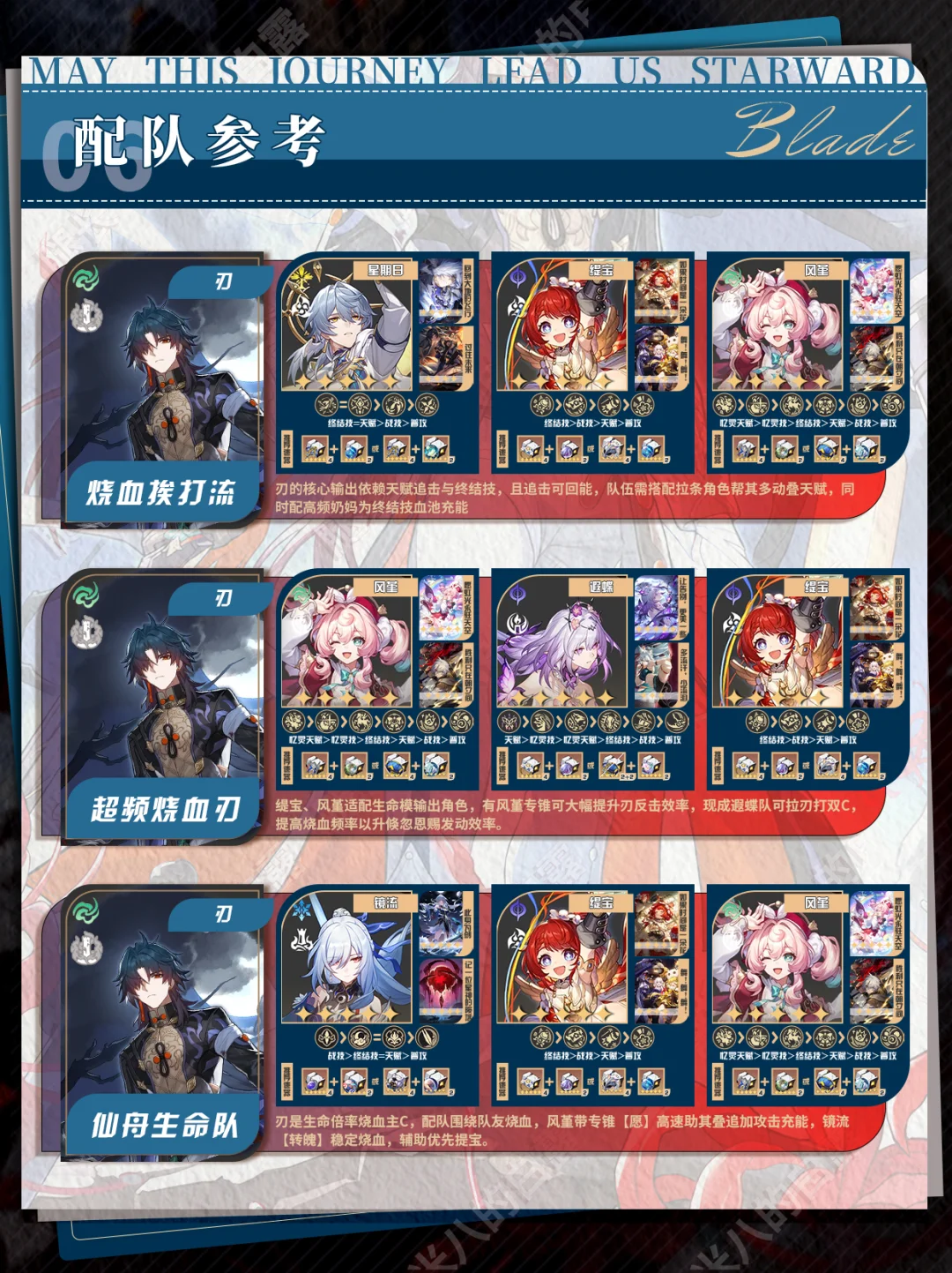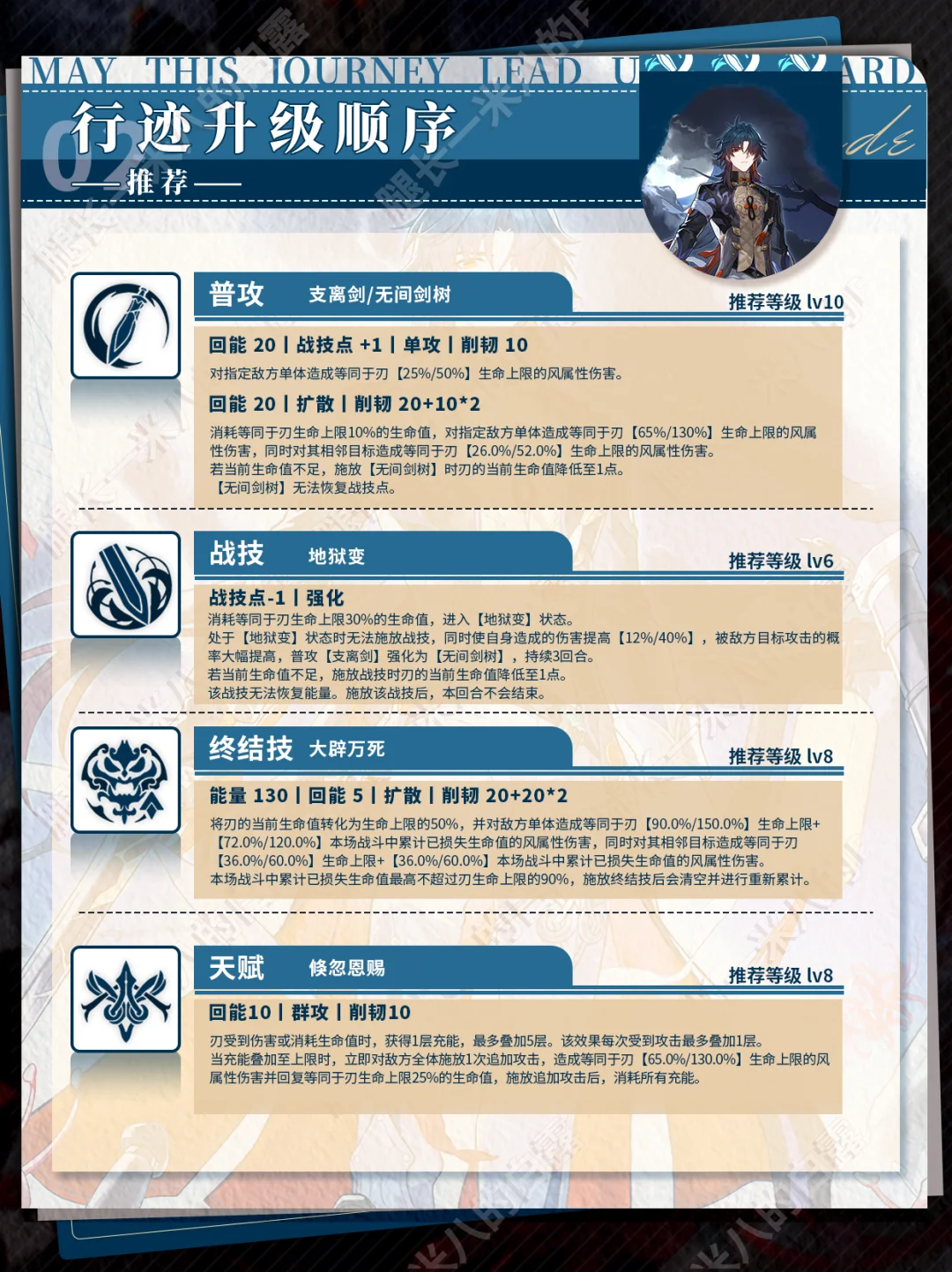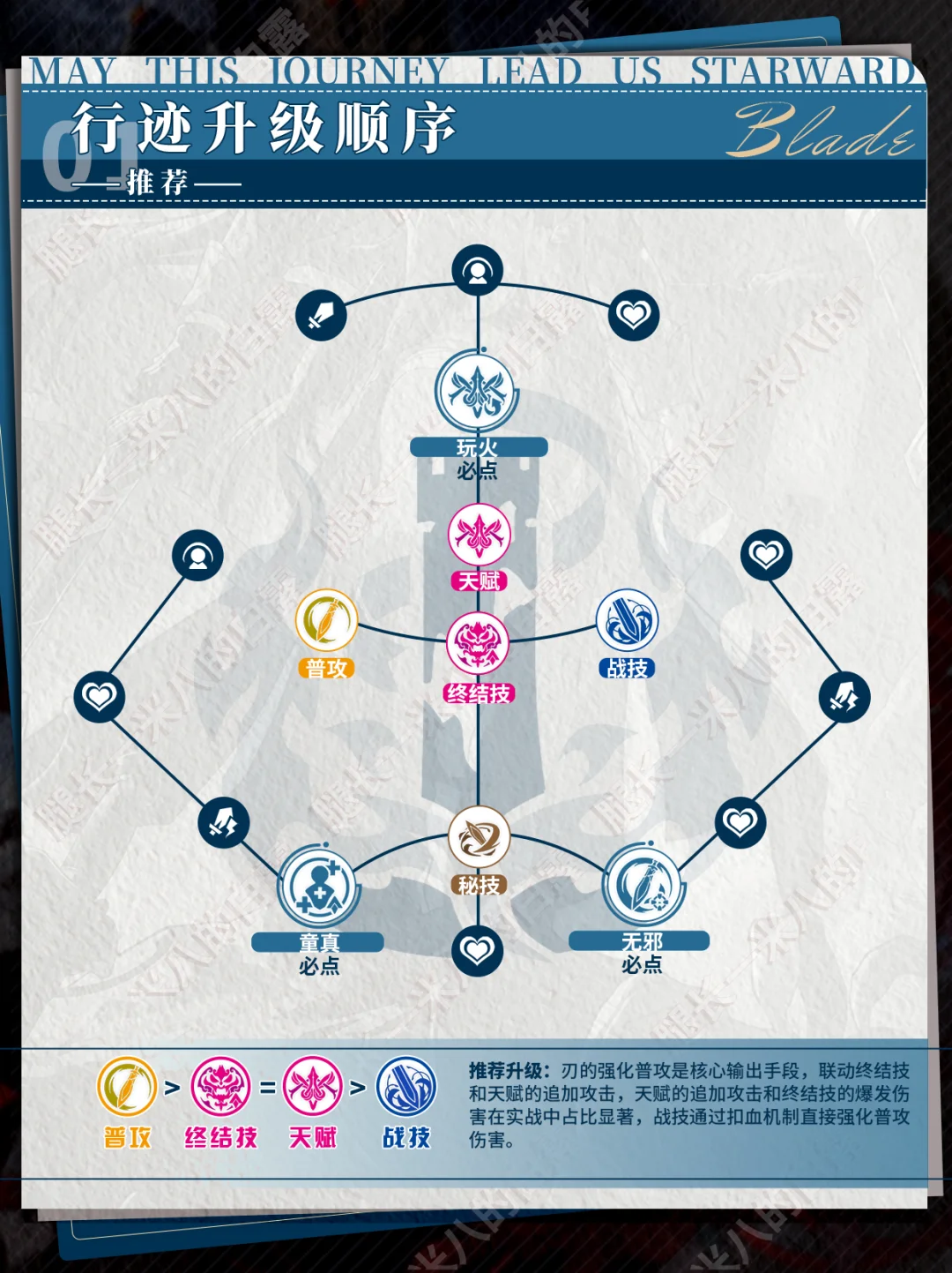 推荐升级:刃的强化普攻是核心输出手段,联动终结技和天赋的追加攻击,天赋的追加攻击和终结技的爆发伤害在实战中占比显著,战技通过扣血机制直接强化普攻伤害。