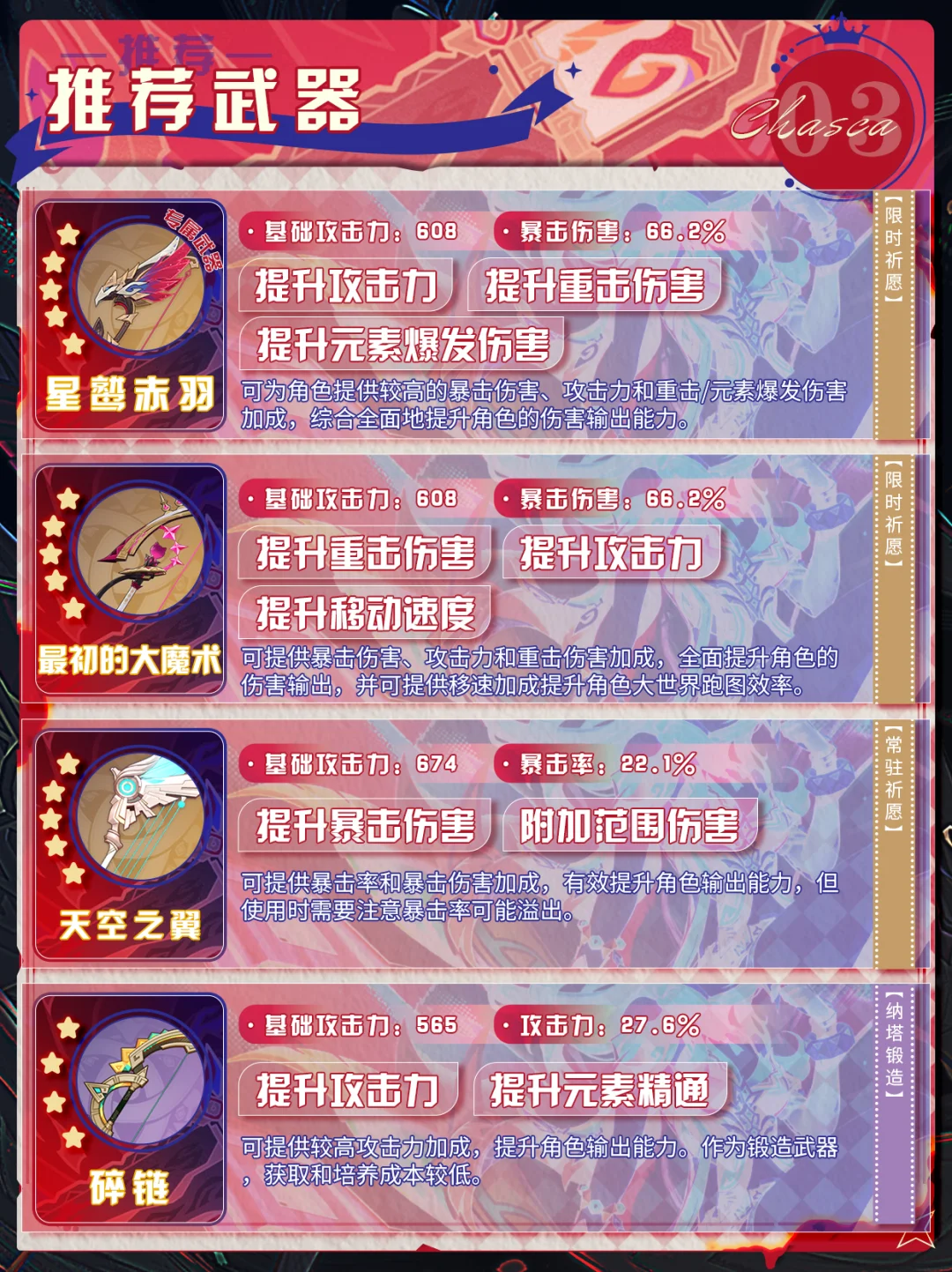 天空之翼:可提供暴击率和暴击伤害加成,有效提升角色输出能力,但使用时需要注意暴击率可能溢出。