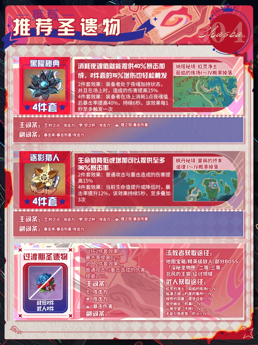 星鹫血羽:可为角色提供较高的暴击伤害、攻击力和重击/元素爆发伤害加成,综合全面地提升角色的伤害输出能力。