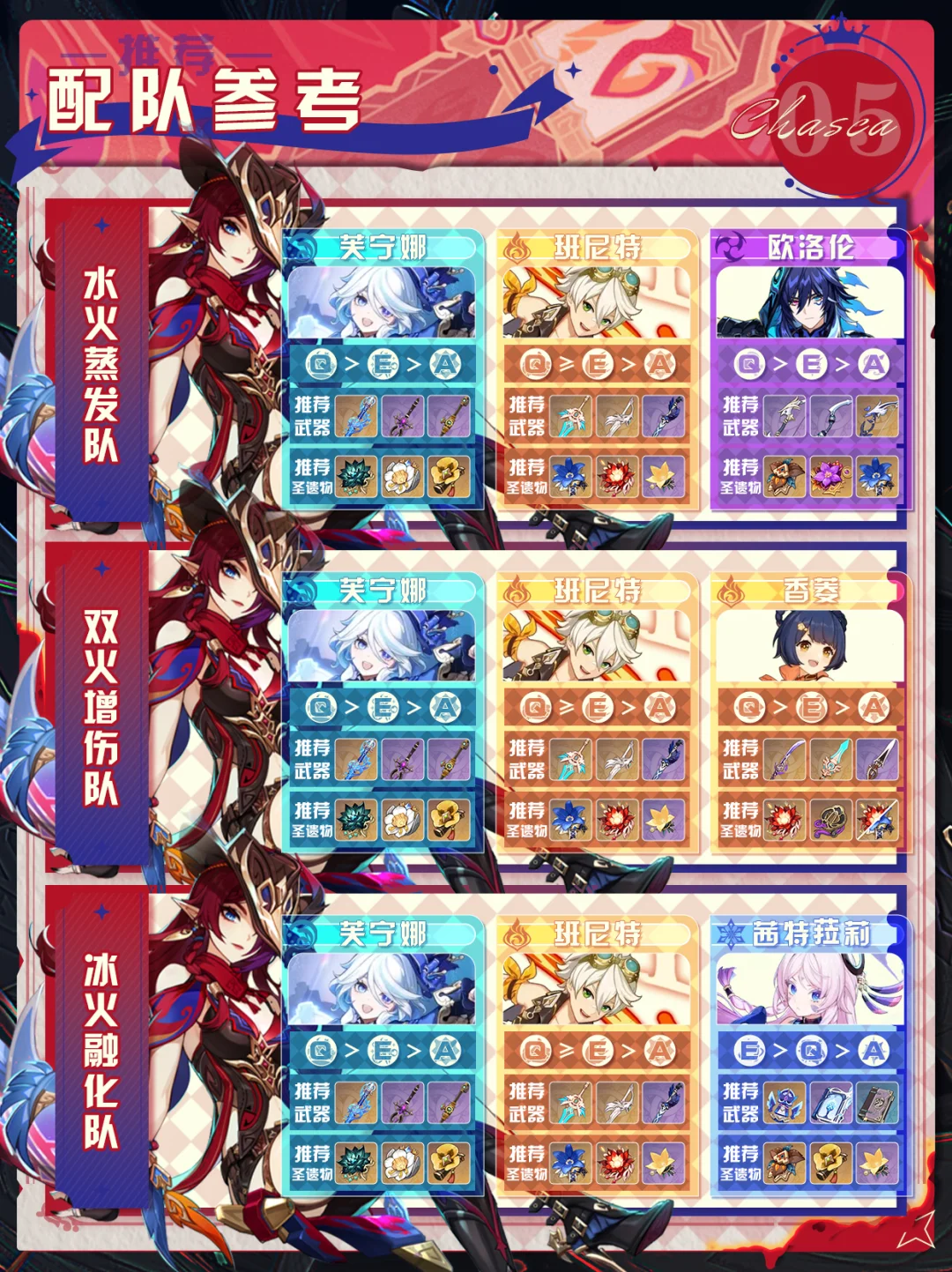 水火蒸发队:恰斯卡+芙宁娜+班尼诗+欧洛伦
