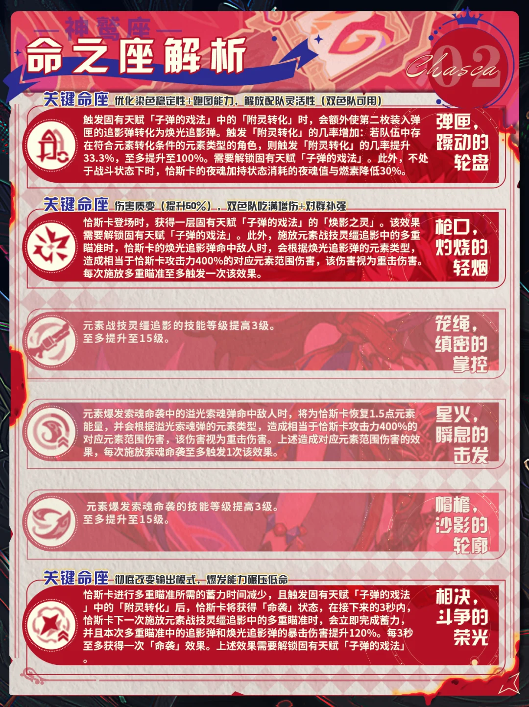 恰斯卡进行多重瞄准所需的蓄力时间减少,且触发固有天赋「子弹的戏法」中的「附灵转化」后,恰斯卡将获得「命袭」状态,在接下来的3秒内恰斯卡下一次施放元素战技灵缰追影中的多重瞄准时,会立即完成蓄力,并且本次多重瞄准中的追影弹和焕光追影弹的暴击伤害提升120%。每3秒至多获得一次「命袭」效果。上述效果需要解锁固有天赋「子弹的戏法」