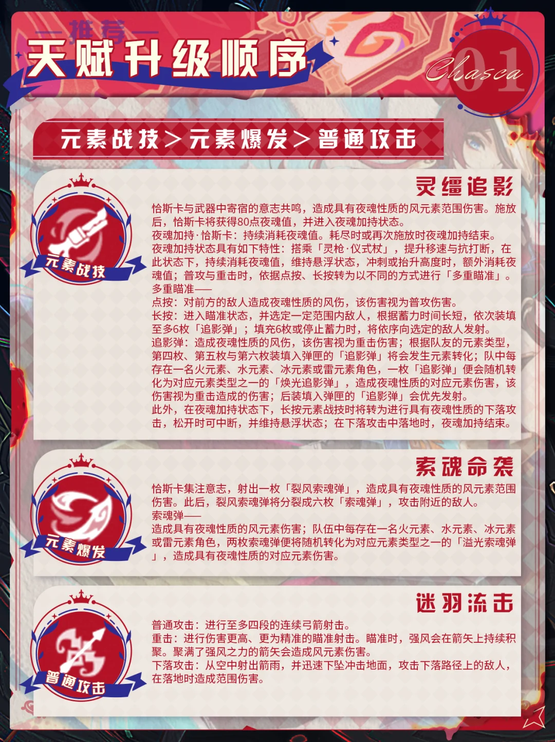 触发固有天赋「子弹的戏法」中的「附灵转化」时,会额外使第二枚装入弹匣的追影弹转化为焕光追影弹。触发「附灵转化」的几率增加:若队伍中存在符合元素转化条件的元素类型的角色,则触发「附灵转化」的几率提升33.3%,至多提升至100%。需要解锁固有天赋「子弹的戏法」。此外,不处于战斗状态下时,恰斯卡的夜魂加持状态消耗的夜魂值与燃素降低30%。