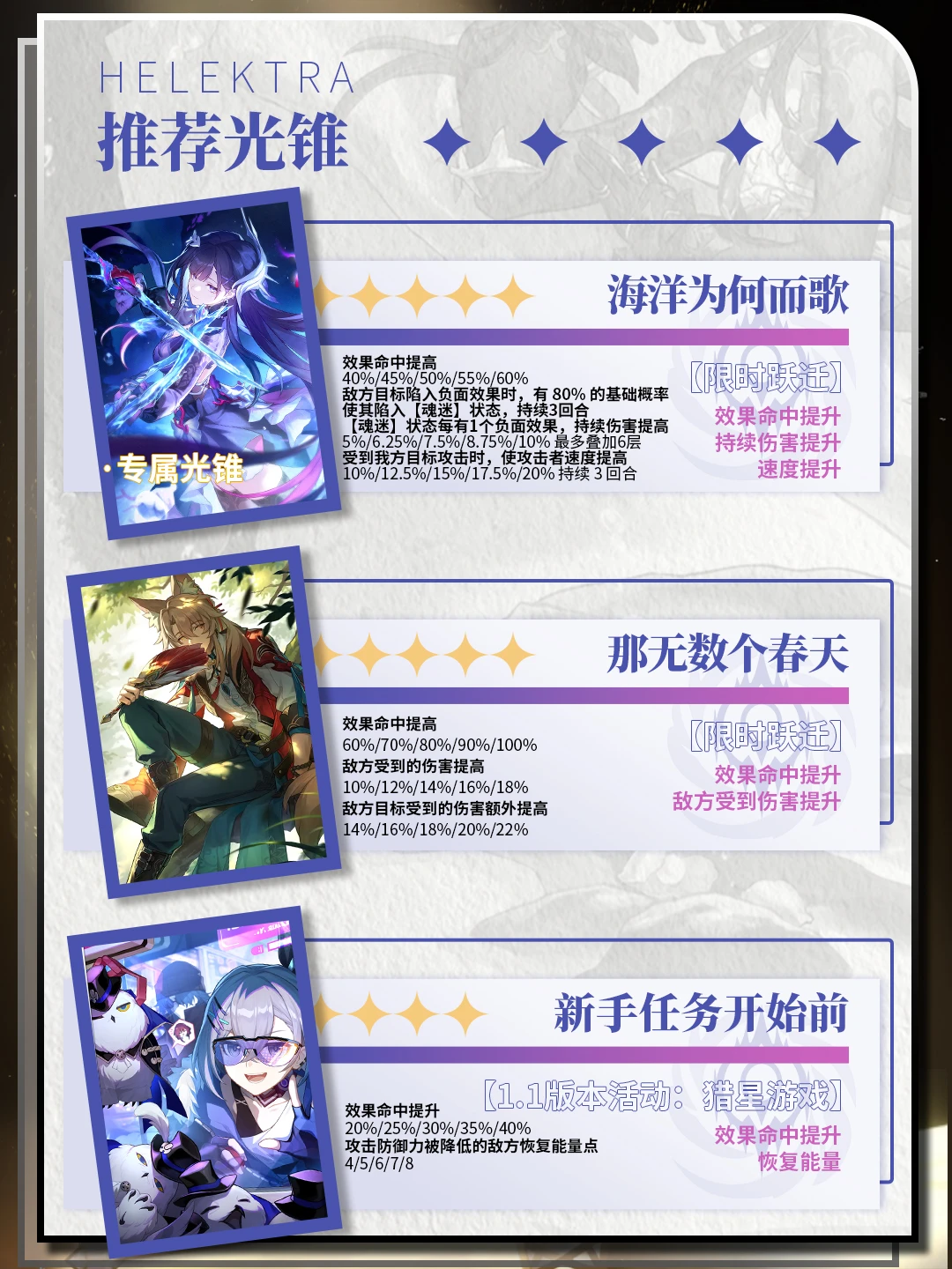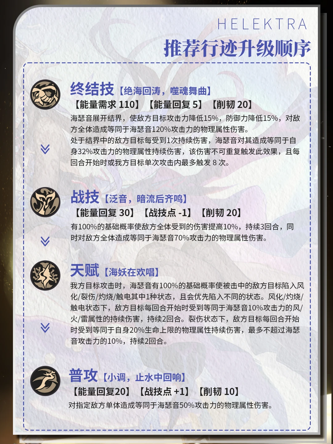 有100%的基础概率使敌方全体受到的伤害提高10%,持续3回合,同时对敌方全体造成等同于海瑟音70%攻击力的物理属性伤害。