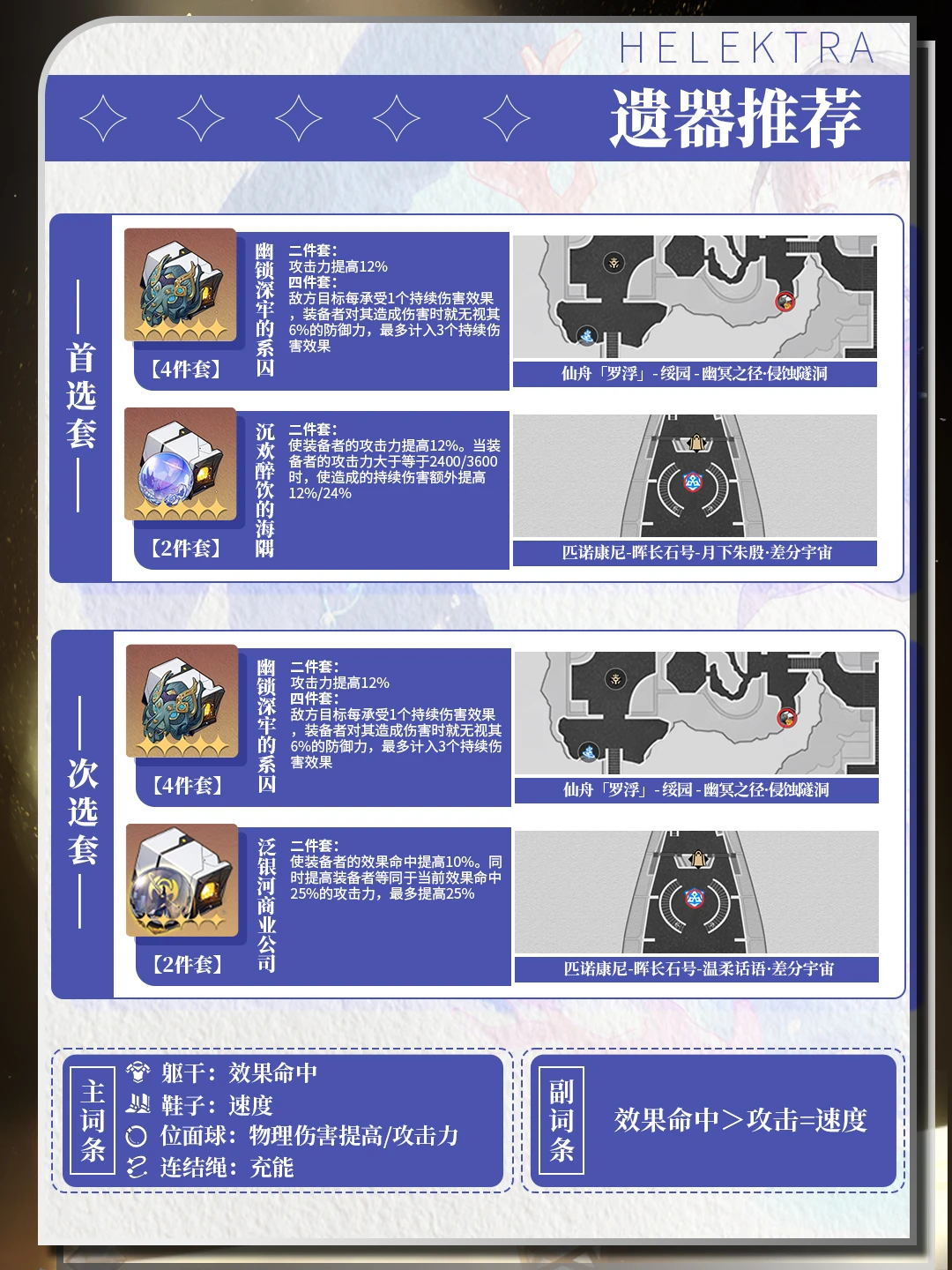 海瑟音在场时,我方目标造成的持续伤害为原伤害的116%,当海瑟音通过天赋使敌人陷入风化/裂伤/灼烧/触电状态时,有100%的基础概率额外使其陷入一次与原天赋效果相同,且可同时存在的风化/裂伤/灼烧/触电状态。