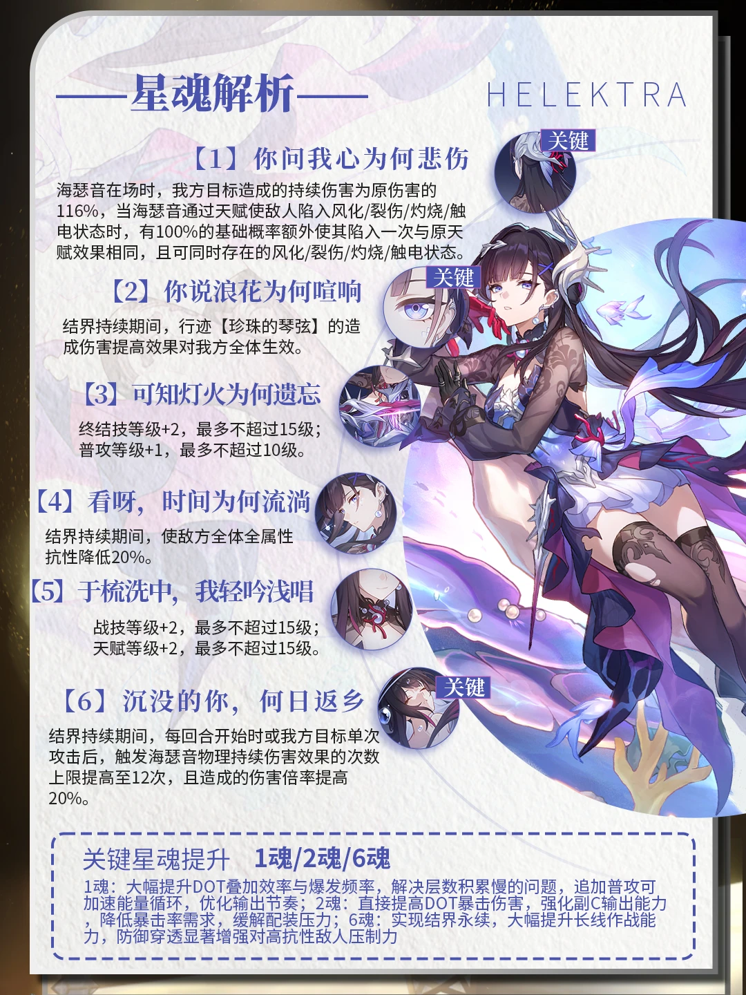 定位:海瑟音是一名可依据目标持续伤害数量,额外造成相应次数持续伤害的输出型角色。同时,她还可以高频地令敌方陷入多种持续伤害状态,并能对敌方造成减攻、减防、易伤等负面效果。