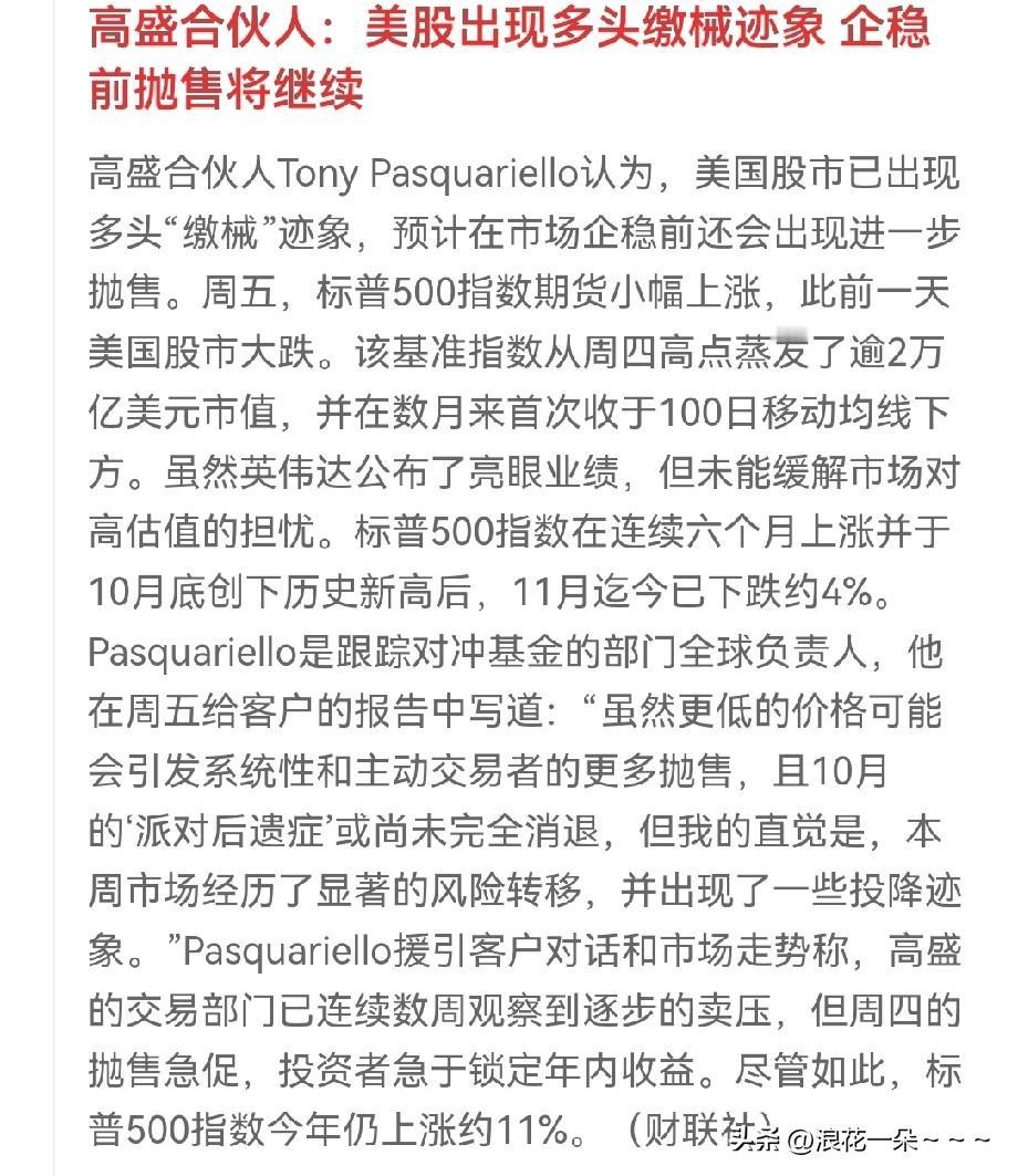 夜深了!都钻被窝了吗? 看看今天晚上美股的走势,目前来看还算是可以,高开低走,但是跌的不多,特别注意的是,科技股的代表英伟达还是再继续下跌之中,截至我发稿,英伟达已经下跌1.3%,总体来看,由于趋势已经破位,还在下跌通道之中,什么时候止跌还很难说。 当然,不得不说,这段时间美股继续下跌在我看来又有了新的原因。一个是美国劳动力就业市场疲软,虽然白宫政府说就业市场很好,但是,在美国机构看来,那都是一些假的数字,资本并不买账,所以说,接下来降息的预期反而又提高了。 当然,第2个原因我想大家也看到了,就是图二中高盛合伙人的分析,按照他们的分析,现在美股还是要继续调整的,空头已尽占上风,多头已经缴械投降,这也可能与部分机构看空AI泡沫有关。 所以说,反观今天的A股下跌调整,应该是也是在情理之中的了,毕竟亚太股市都在跟着美股的走势嘛。 展望下周,在我看来,下一周并不乐观,大家还是谨慎为好。你们认同吗?