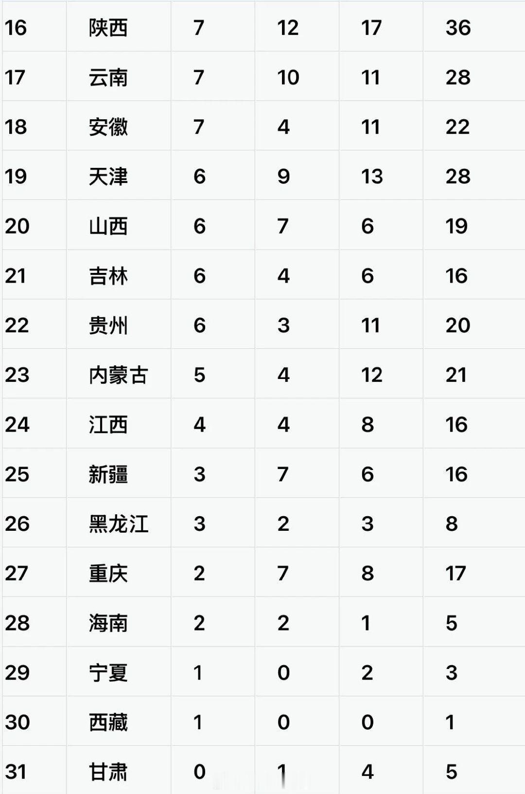 2025第十五届全运会奖牌榜。山东五连冠,广东、浙江居二、三位。澳门颗粒无收。基本与经济发展正相关的榜单。