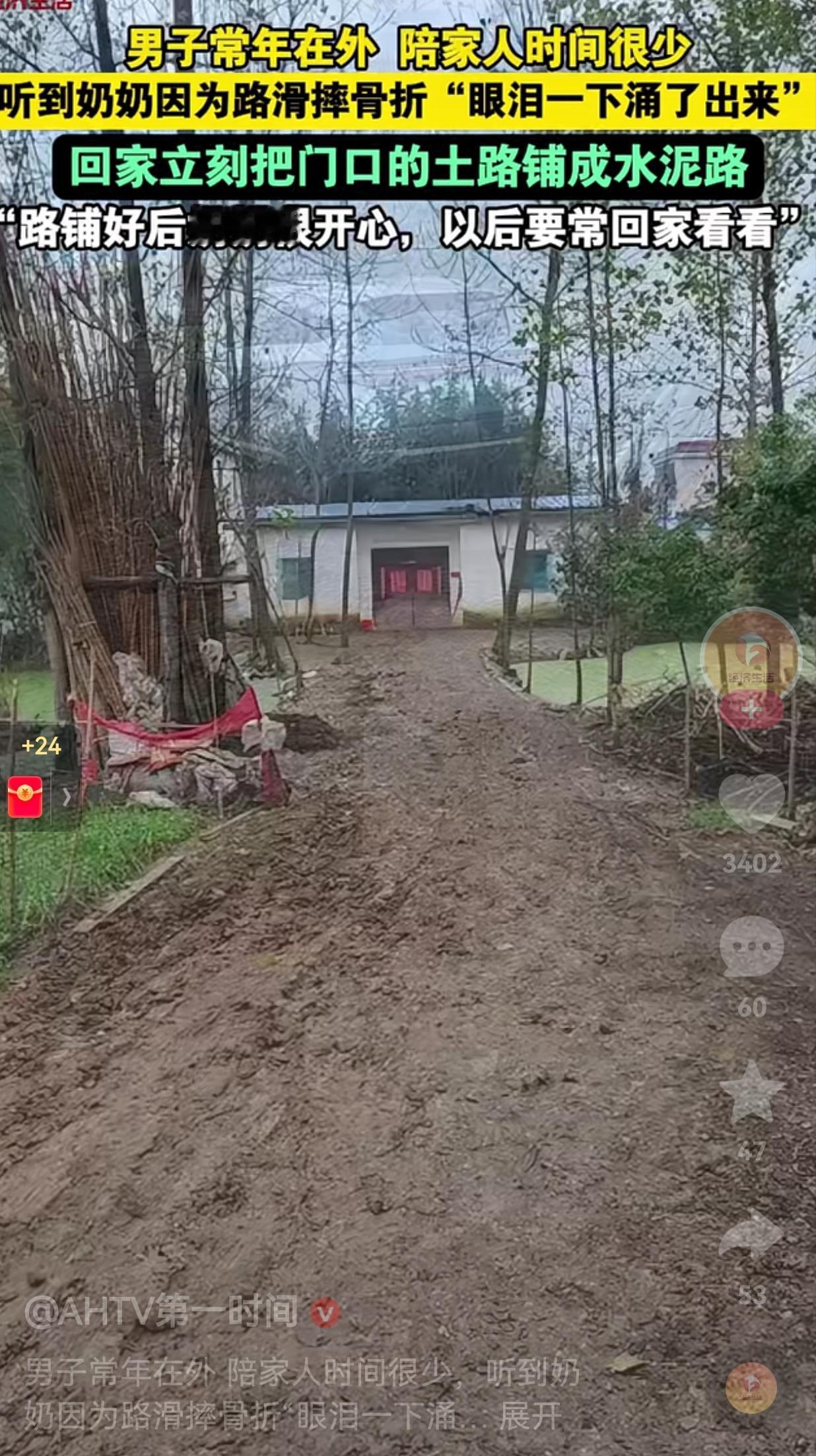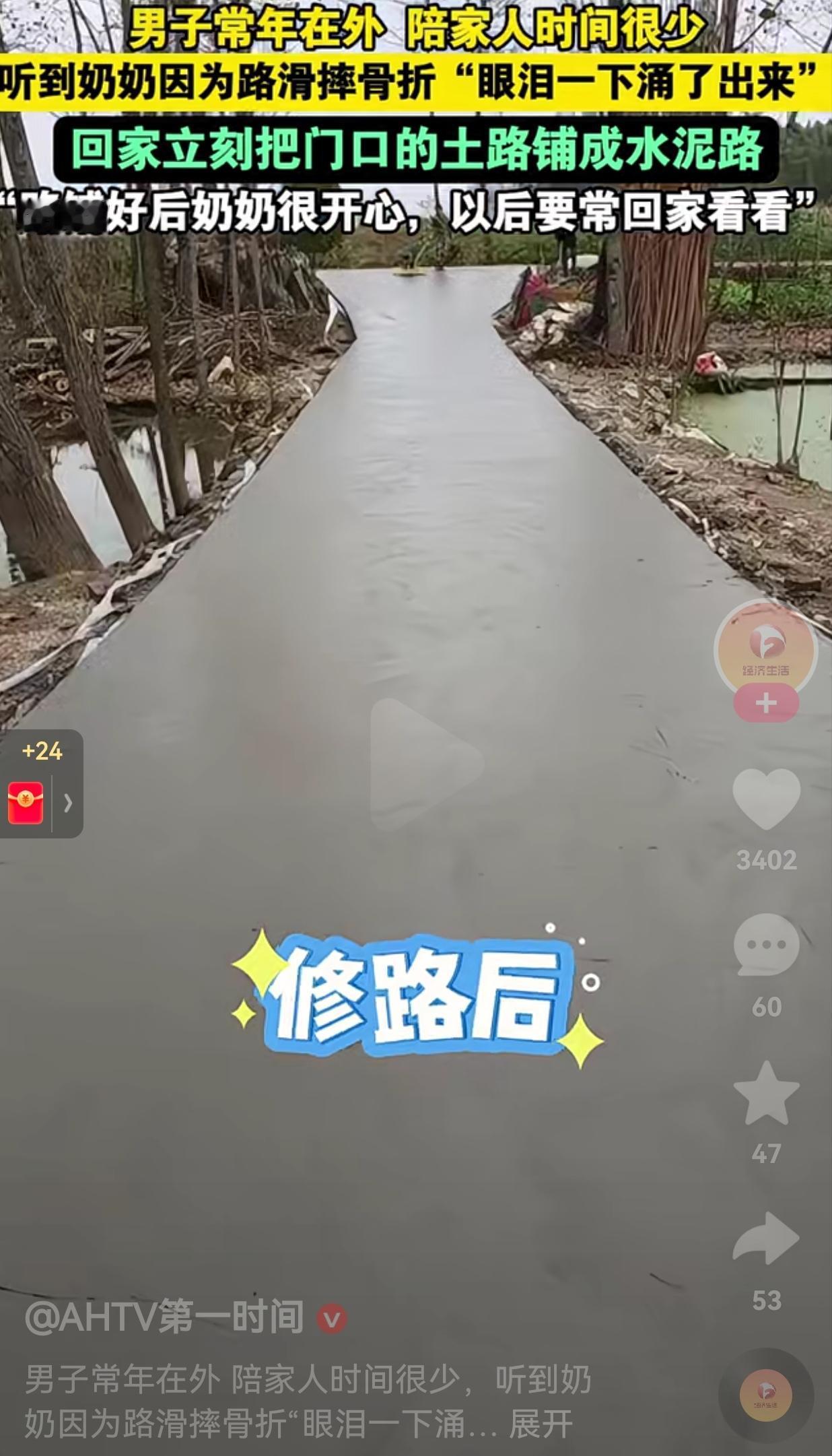 有空一定要常回来看看!别让在老家的老人太过于孤独!一男子常年在外地打工,回来的次数很少,也只有过年才回家一次。因此,陪伴家人的时间那是少之又少。 前一段时间,老天爷经常下雨,由于老家门口的路没有修,都是泥巴路,路很滑。 一次奶奶外出,不慎滑倒了!这一摔不当紧,奶奶摔成骨折了! 奶奶跟孙子打电话,就把这件事情告诉了男子,男子听到奶奶受伤了,很是心疼奶奶,眼泪一下子涌了出来。因此,男子二话不说,就回家看望奶奶。 男子回到家之后,看到老家门口的路况确实很糟糕,为了方便奶奶出行,男子就把家门口的路修成了水泥路。 修好的当天晚上,男子就询问奶奶:“家里的路修好了,您开心吗?” 奶奶看到孙子为自己铺路,怎么可能不开心呢?连忙说:“当然开心了!” 网友看到后评论说,真好,这样奶奶就不会摔了,鞋底也干净! 家有一老,如有一宝,身为子女还是要多回家看一看,老人年纪大了,真的是见一面少一面,千万别等到“子欲养而亲不待”的时候,才徒增伤感,到那时说什么都悔之晚矣了! 大家觉得呢?欢迎大家评论区讨论留言。