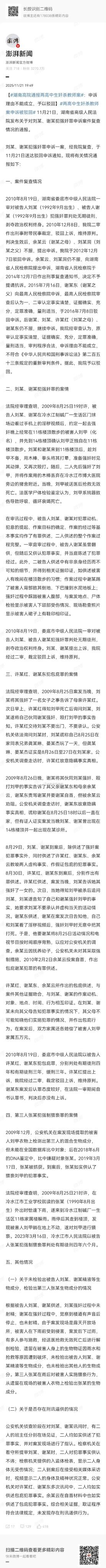 湖南那起闹了十几年的“高中生js教师案”,最终还是维持了原判,刘某和谢某到现在都没认过罪,一直在服无期徒刑。 法院给出的说法是,虽然现场没检出两人的生物痕迹,但他俩交代的作案细节——比如踢老师后背、踩肚子这些关键情节,和法医鉴定的尸体伤情、现场留下的鞋印都能对得上。 没找到生物证据,是因为两人说作案时没s精,再加上案发后有不少人去现场施救,露天环境下的物证自然就被破坏了。而且审讯的时候,他俩的班主任全程在场见证,之后检察机关提审时,两人也没翻供,入监体检也没发现有被刑讯逼供的伤痕,所以取证过程是合法的。 还有个关键人物张某,2018年通过现场DNA比对被找到,他被抓后承认,案发后曾趁老师倒地不动的时候实施了猥亵,但他的行为和老师的死亡没关系,最后因为强制猥亵罪被判了4年6个月,当时相关的鉴定材料也在庭审上出示过,经过了依法审查。 另外,当初两人的父母因为包庇他们的犯罪行为被判了刑,家属还向被害人亲属赔偿了5万元,这些旁证也能印证案件事实。法院后来又经过了多次复查,都认定原判事实清楚、程序合法。 值得一提的是,刘某和谢某至今仍坚决拒绝认罪,始终抱着“要么清白出狱,要么牢底坐穿”的态度,不愿写悔过书争取减刑机会。 但在现有司法框架下,该案的审判与多次复查程序均符合法律规定,此次申诉被驳回后,已无重新审判的法律依据,二人最终仍将继续执行无期徒刑,这场持续16年的案件也随之尘埃落定。