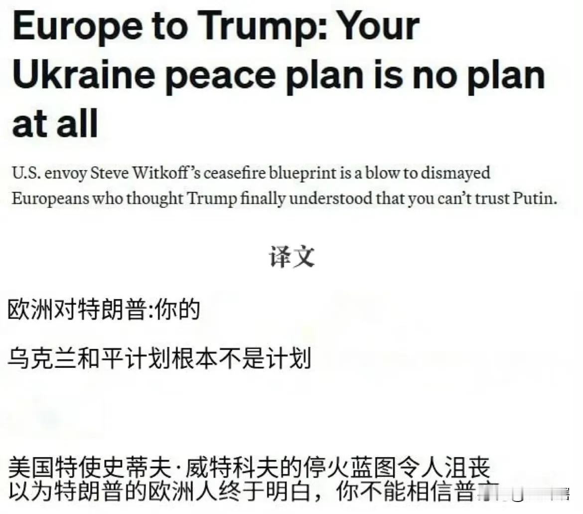 【欧洲很不满美国提出的乌克兰和平计划】 据外媒消息,欧洲国家对于美国提出的28点乌克兰和平清单表示非常不满,欧盟表示将制定有利于乌克兰的新和平计划,并希望说服乌克兰接受。 欧洲国家认为,美国提出的方案肯定会令俄罗斯满意,但确是让乌克兰处于被动的一方。 有消息称,美国计划清单中包括乌克兰必须以领土换取和平,并且承诺裁减军队规模和永不加入北约等。