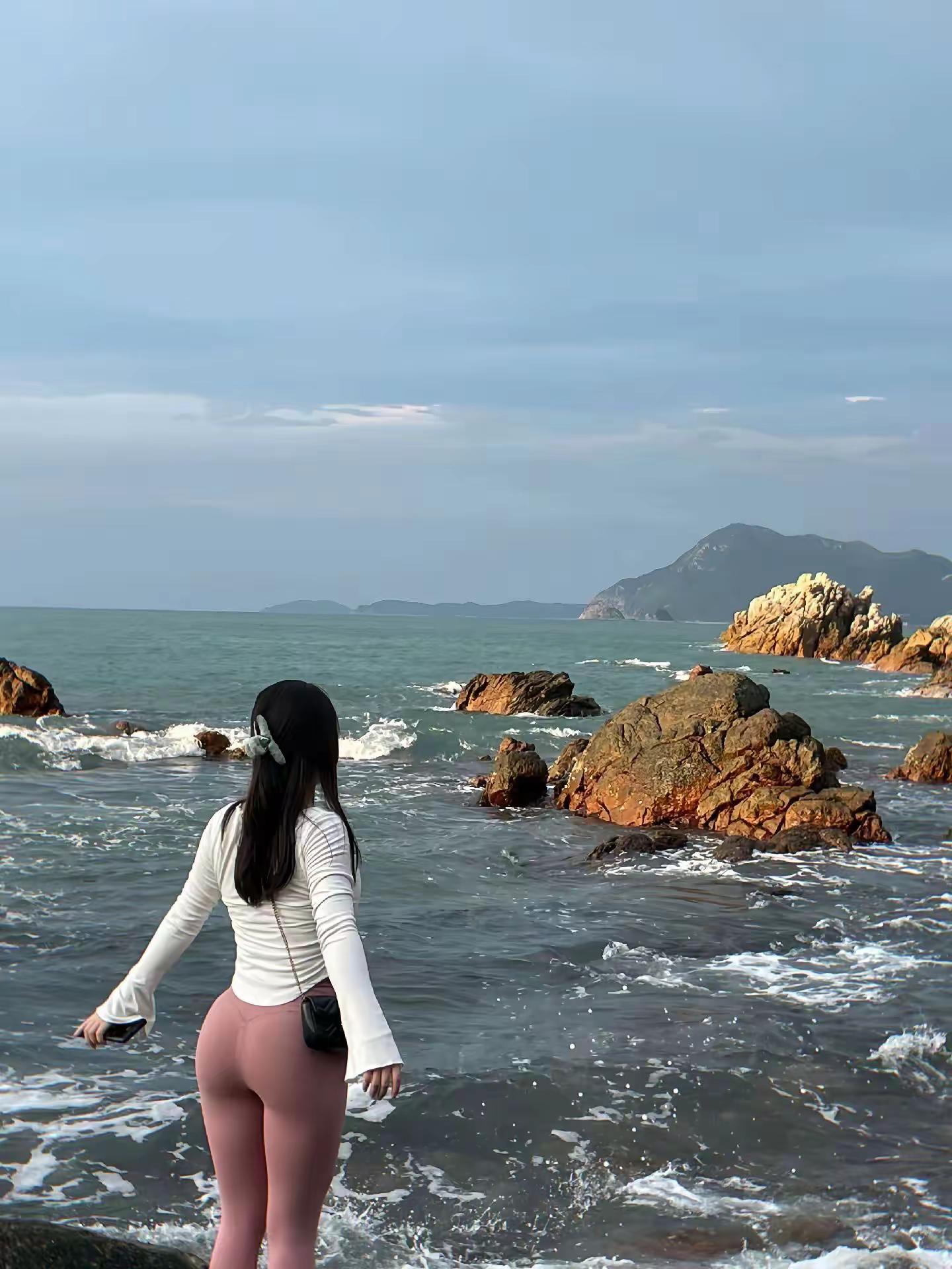 海边拍照。鲨鱼裤搭配,紧身提臀显身材。辣妹穿搭 海滩美女 紧身裤
