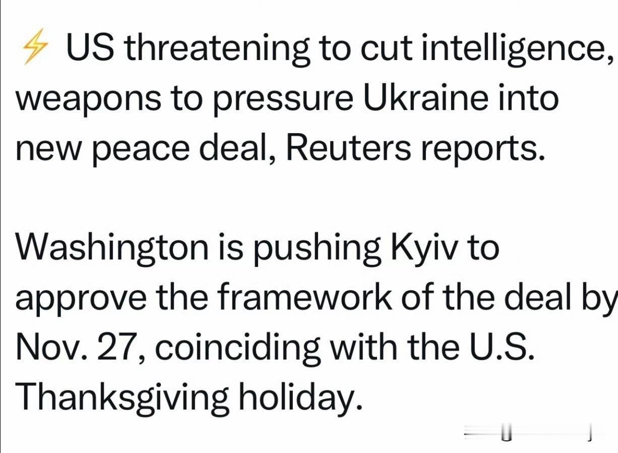 路透社报道:美国威胁乌克兰,如果不接受28条,会切断情报和武器 特朗普政府要求:感恩节(11月27日)前批准框架协议 。 近日多家媒体的报道,美国特朗普政府确实被曝向乌克兰提出了一份包含重大让步的和平计划,并为该计划设定了答复期限,同时以切断情报信息和军事援助作为施压手段。 对于乌克兰而言,这无疑是一个极其艰难的选择。泽连斯基已表示国家正面临"非常困难的选择"。接受计划意味着放弃主权领土、国家军事自主和欧洲-大西洋一体化战略,这在国民和部分政治力量看来无异于"投降"。拒绝则可能立即失去维持战争的关键外部支持。 而美国的这一战略转向,表明特朗普政府的战略重点可能发生了根本性转变,从帮助乌克兰获胜转向以最快速度达成停战,即使条件被认为对乌克兰高度不利。这种"速成"式的外交也因绕过乌克兰和欧洲盟友而受到批评。 其实特朗普完全不用这么周折,乌克兰本身就没有实力与俄罗斯进行一场旷日持久的战争,乌克兰之所以能将战争持续到现在,完全靠外援支撑。美国和欧洲都在持续为其提供军事援助。俄乌停战非常简单,美国不再援助,同时施压欧盟国家,完全切断对乌克兰的资金和武器支持,战争很快就会结束。如果特朗普把和平之功揽在自己头上,也能说的过去。 现在的关键是美国能否放弃对乌克兰的支持(如切断情报信息),欧洲能否接受美国的断援施压。这两点能实现,俄乌停战水到渠成。(个人观点,仅供参考)
