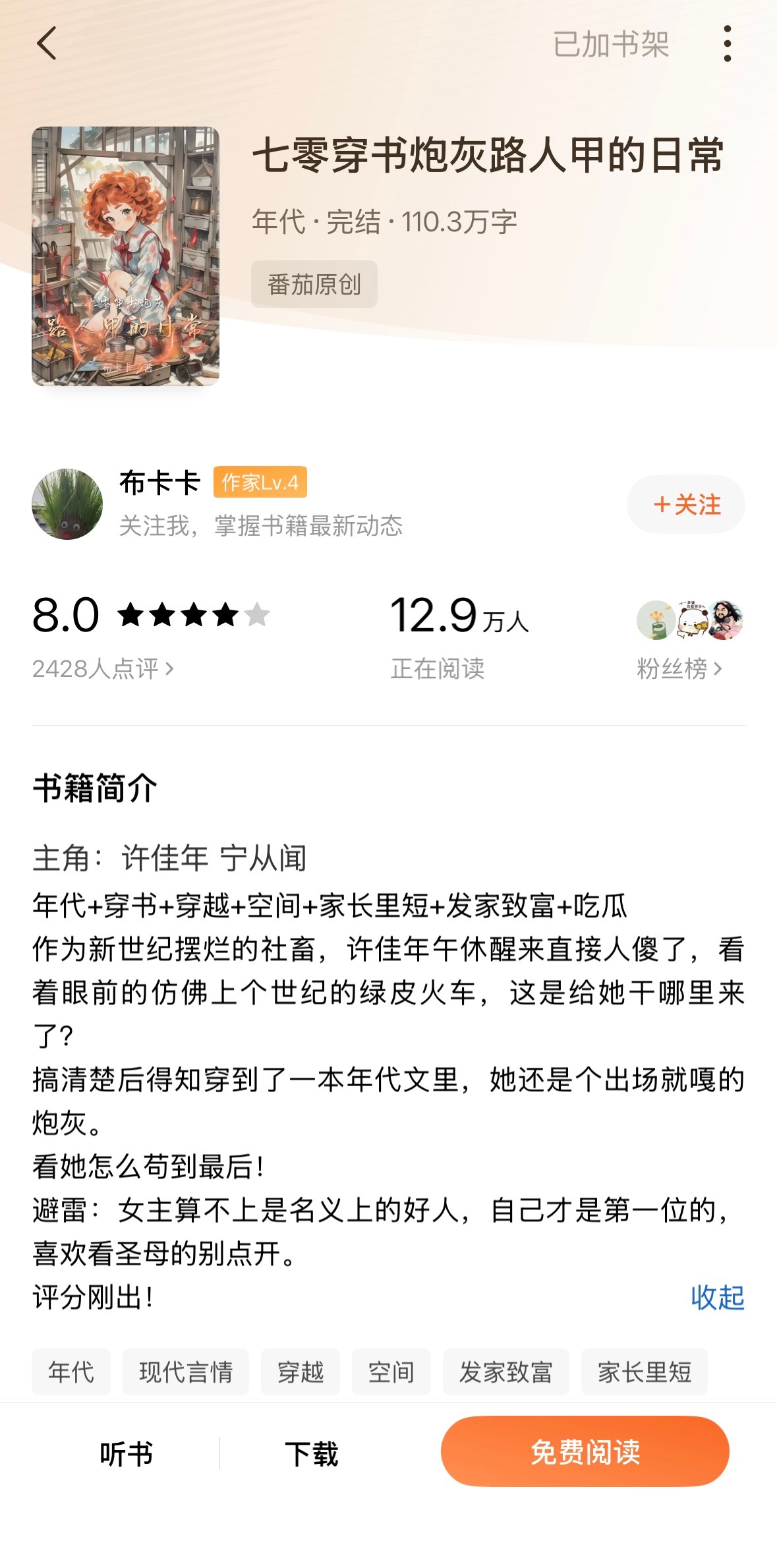 《七零穿书炮灰路人甲的日常》布卡卡▫️许佳年x宁从闻▫️年代文女主发现自己穿成了一本年代文里的炮灰路人甲,穿书第一关就是要度过自己的死劫。女主从一开始就活得小心翼翼的,虽然她也有空间这个金手指,但她基本不怎么用,除了放钱和一些重要的证件,平时基本都当金手指不存在,以一个普通人的身份好好生活着。女主为了避免麻烦,特意剪短了头发,加上原主被渣爹后妈虐待得够惨,她在众人面前的形象就是一个惨兮兮的炸毛骷髅头。虽然女主刻意削弱了自己的存在感,但她的倒霉体质总是让人觉得她好欺负犯到她头上,当然女主也不是好欺负的,不仅嘴上骂得难听还会动手打回去,所以在大队里也是出了名的难搞。女主不在乎名声,只在乎自己的日子过得舒不舒坦。感情线作者写得好现实也好冷静,男主的家世不凡,性格也强势,整天就是一副不好惹的样子。男女主对彼此第一印象都不好,但男主后来发现了女主挺有意思的对她产生了好奇,也把她当成了小宠物一样逗着玩,然后才慢慢喜欢上她。而女主根本不喜欢男主,和他交好也是知道他惹不起但有门路能帮她买到她想要的东西。而男主是一个控制欲极强的人,他喜欢女主就必须要得到女主,根本不允许女主有第二个选择,甚至为了逼女主和他在一起而威胁她会改她高考志愿。女主权衡利弊后,觉得嫁给男主是最好的选择了。婚后男主还是被女主调教后才懂得怎么尊重女主。这本的女主由于过于清醒和冷静一直被骂她为什么不爱男主,评论区里都在替男主委屈着呢,可男主乐意啊,他从一开始就知道女主不爱他他还是乐意啊~ps:这本最大的毛病就是作者好多错别字➕病句!!