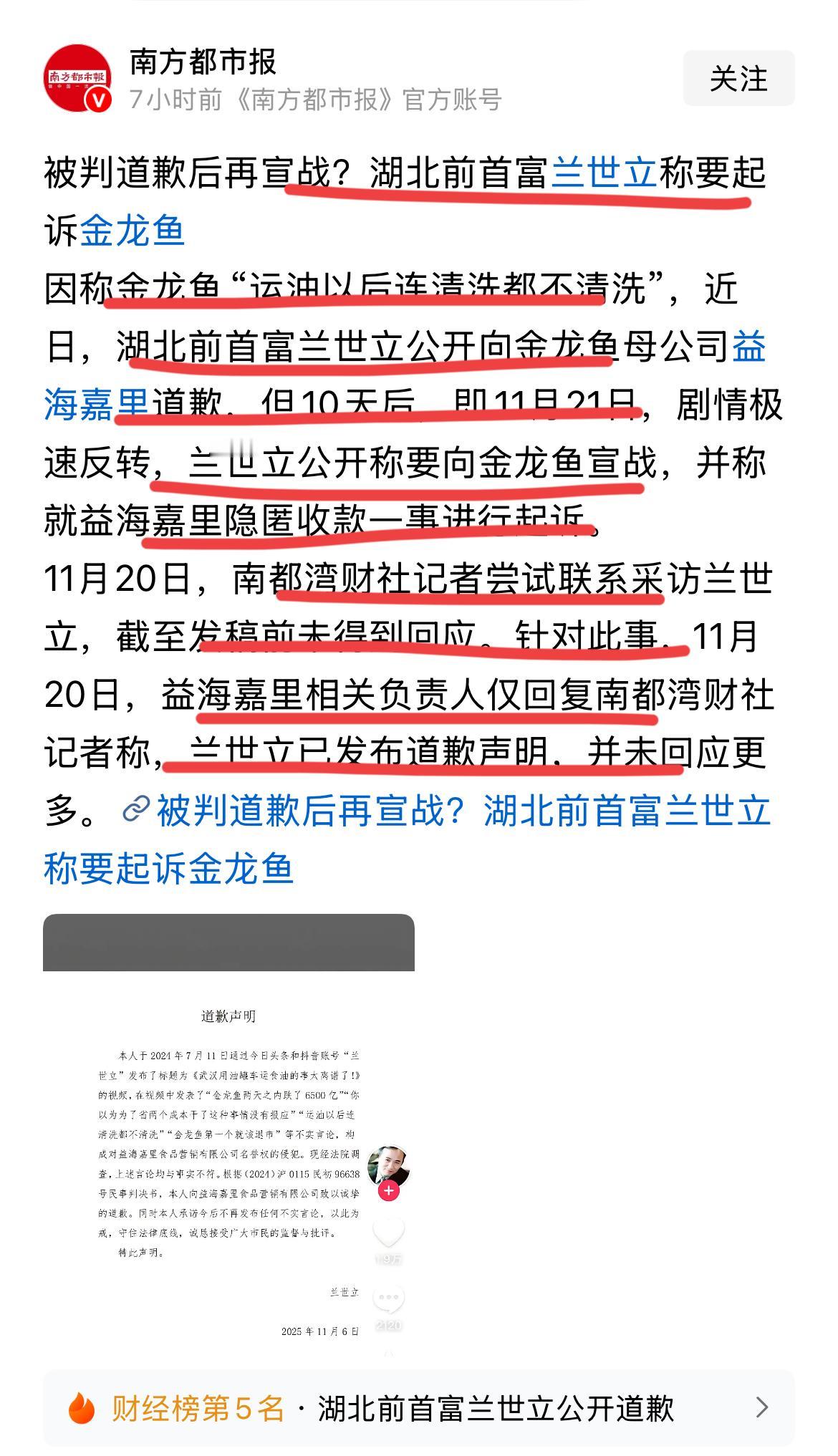著名企业家,湖北前首富兰世立彻底怒了! 在不久前,他被某食用油巨头起诉,并被判决败诉,赔偿对方一万元,后来他的财务估计是看错了金额,怎么才一万元?于是,罚打款了十万元,不知道什么原因,他还是被冻结了账户,他表示,当时正在境外出差弄得非常尴尬!他越想越生气,本来道歉了,也就完了,这巨头也太过分了,变本加厉,欺人太甚!他经过深思熟虑决定起诉这个巨头,他认为,某地的法院判决,他不不认,他决定上诉,讨回公道! 兰总已经召开了新闻发布会,正式向金龙鱼宣战,还曝光了很多匪夷所思的内幕!看到非常吓人,巨头都是这样的吗,尤其兰州曝光的融资,几百亿,尽千亿,钱去哪里了,融资这么多钱干啥呢?细思极恐啊,对此,你有何看法,你支持兰总起诉某食用油巨头么?