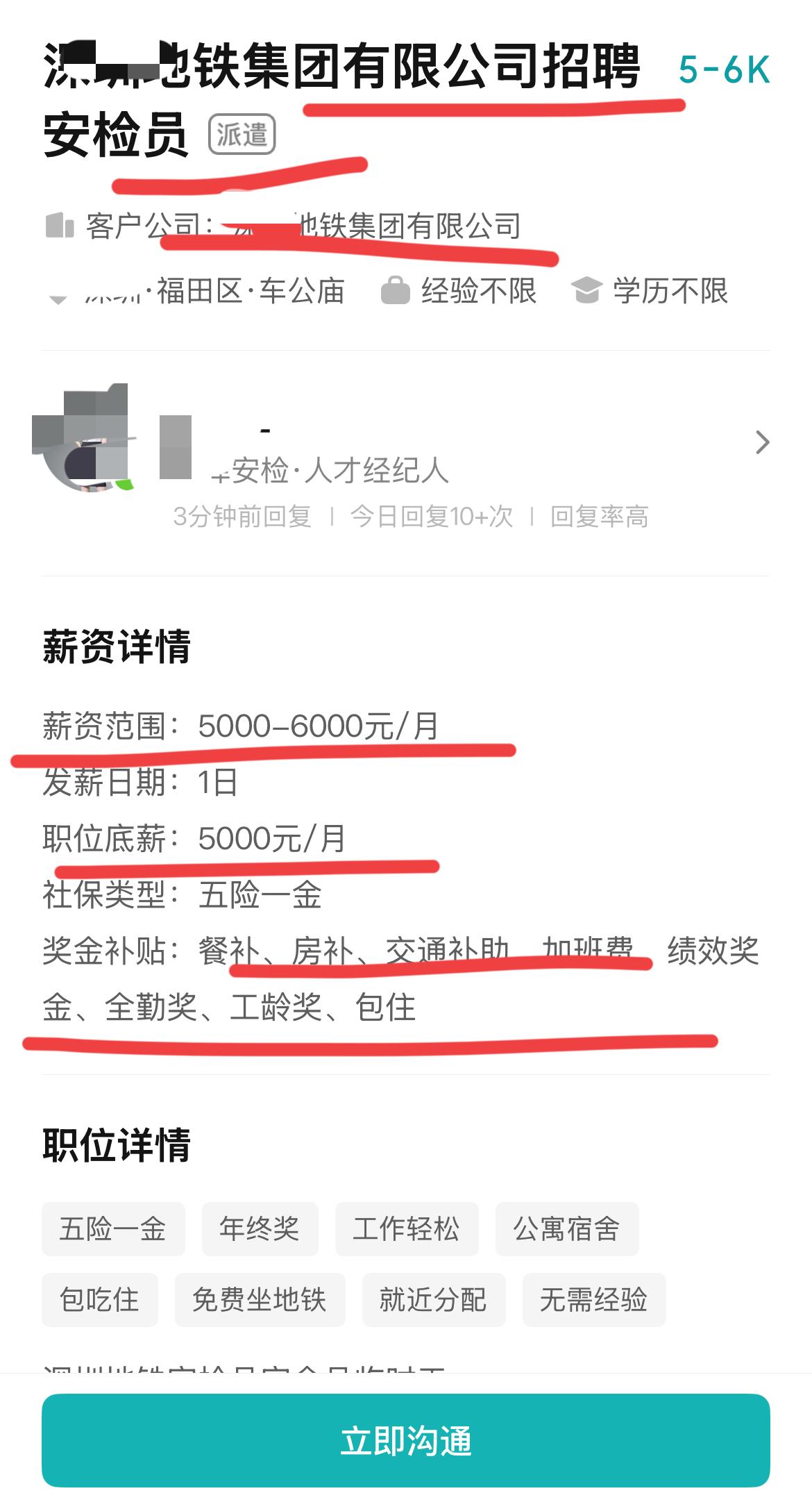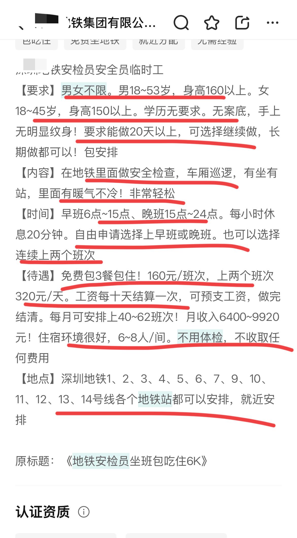 这些到处招聘安检员的信息,是真的吗? 我看到有些地方的网友说,这些都是套路!! 并不是地铁官方招聘的,全部是劳务派遣,跟地铁毫无关系!!只要你发信息问,他们秒回,让你加微信,然后一步一步开始让你进到这个口袋,交钱是不可避免的,各种费用体检费,服装费,培训费,培训后等通知,有的很快上班,但可能上几天就受不了! 想要赚钱,你可能要上16小时,各种扣款,最后一个月赚3000,有某地的安检员说,自己就是上一个班,扣完钱后,最后拿到1600,已经辞职两个月,脚还是痛的! 这是什么招聘啊,真的,假的?太恐怖了吧!