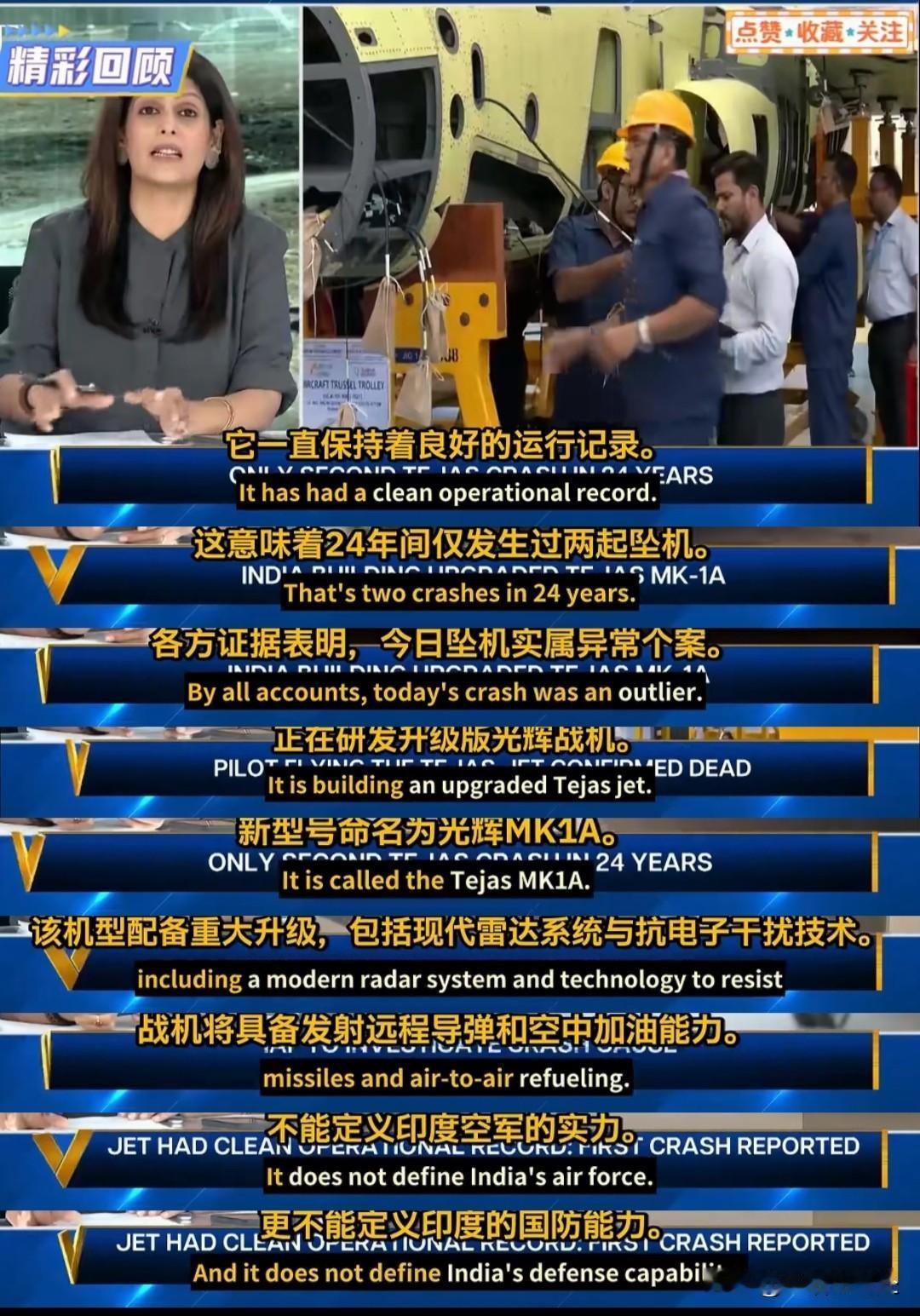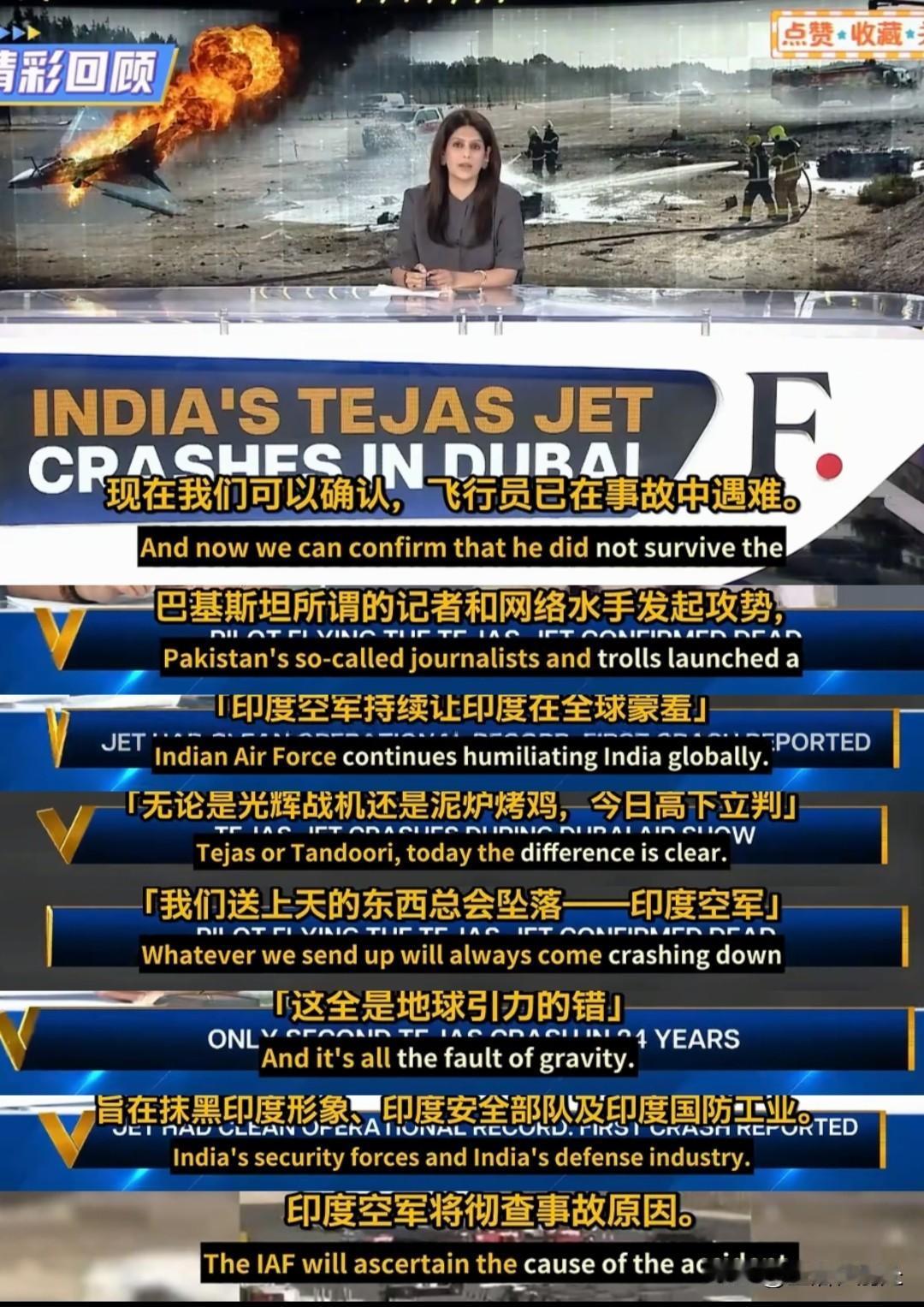 “这全是地球引力的错” “无论是光辉战机还是泥炉烤鸡,今日高下立判” “我们送上天的东西总会坠落一一印度空军” ……诸如这些。 被戏称为“甲亢姐”的印度媒体MV主持人夏尔玛这样报道:2025年11月21日,这是航展史上的悲剧,印度一架“光辉”战机在迪拜航展表演时发生坠毁,现在能确定的是飞行员遇难,还有来自巴基斯坦水军的嘲讽。这引发了大量巴基斯坦网络水军的攻势,他们极尽嘲讽之能事。 “甲亢姐”说光辉战机一直保持着良好飞行记录,24年间仅发生过两起坠机,各方证据表明,今日坠机实属异常个案。这不能定义印度空军实力,更不能定义印度国防能力。 印度正在研究“升级版光辉战机”。