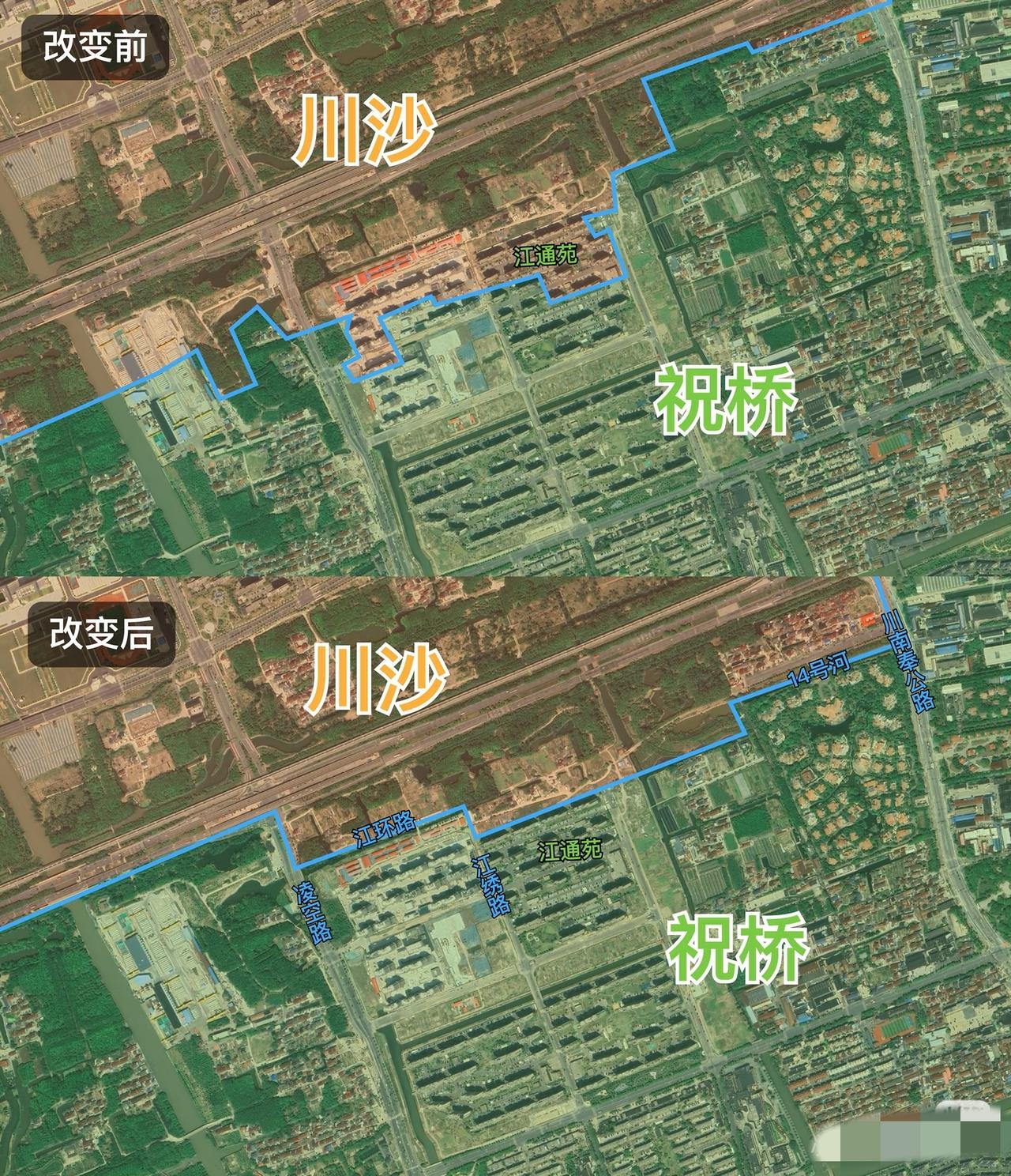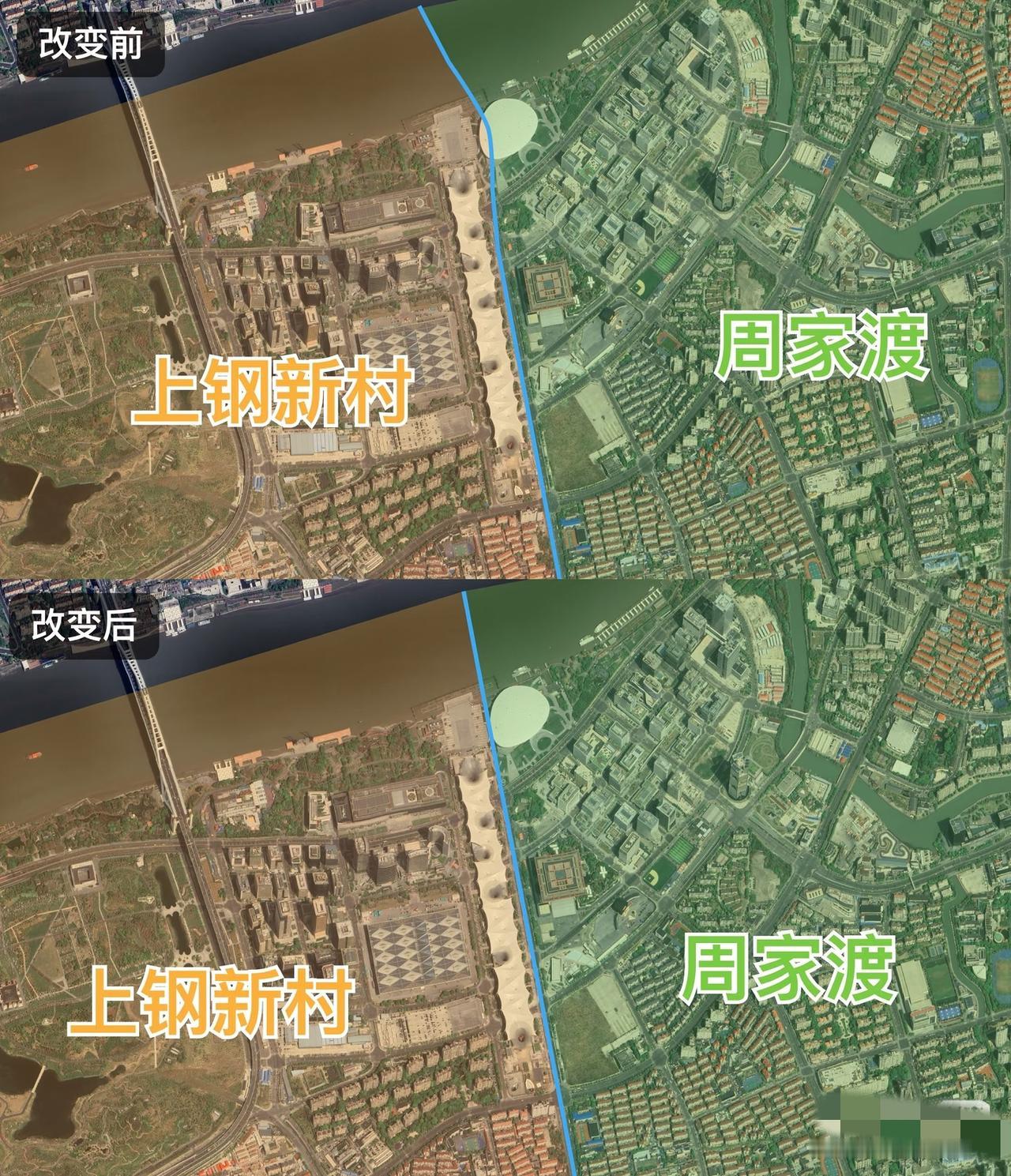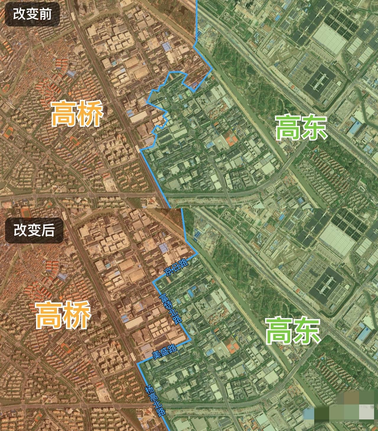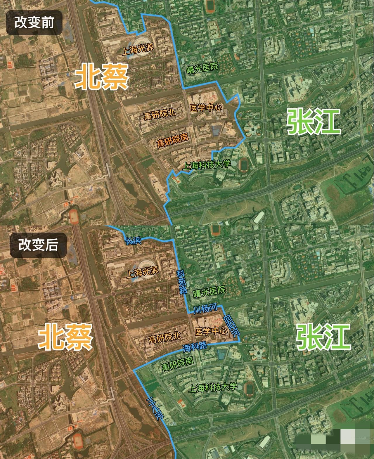 张江镇 vs 金桥镇(P1) 实锤:之前大家关心的浦开江南里,这次明确划入金桥镇管辖(见图1蓝线变化) 边界:沿着云山路、龙东大道切分,非常规整 2️⃣ 张江镇 vs 北蔡镇(P2) 扩容:海科路以南的上海科技大学校区,以前部分属于北蔡,现在全量划归张江。高教园区的管理终于统一了 3️⃣ 高桥 vs 高东 / 周家渡 vs 上钢(P3、P4) 治愈强迫症:大家看P3,以前的界线像锯齿一样乱,现在沿着富特北路直接拉直。P4的梅奔区域也是同理,直接拉直 4️⃣ 川沙新镇 vs 祝桥镇(P5) 以前: 界线在小区附近比较模糊,甚至切过某些地块 现在: 明确以“江通苑小区北围墙”为界,配合川南奉公路、凌空路,把行政范围画得清清楚楚 这样一来,江通苑及周边的行政管辖(比如街道办事、社区服务)就不会出现扯皮的情况了 5️⃣ 花木 vs 潍坊/北蔡 vs 康桥(P6) 没有什么大的变化