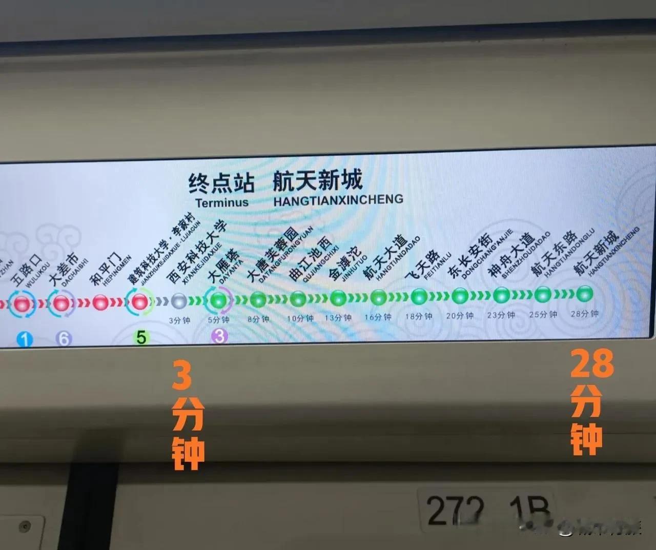 其实我觉得宁波地铁可以借鉴西安地铁的做法,把抵达每一站所需的时间标注出来。如此一来,乘客在规划行程时间时能更清晰明了。 西安地铁上面无论你去哪一站都会有时间的标注,比如说从建筑科技大学到下一站西安科技大学需要3分钟,到终点站航天新城需要20分钟。